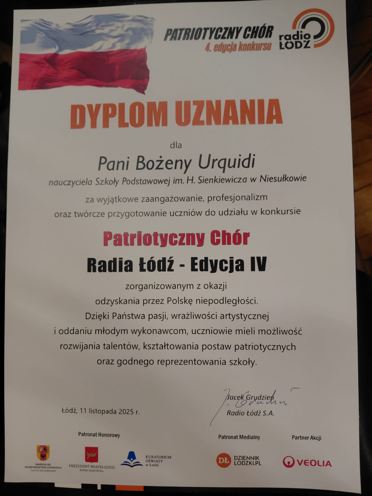 W październiku 2025 nasi uczniowie ze Szkoły Podstawowej w Niesułkowie wzięli udział w kolejnej edycji konkursu Patriotyczny Chór Radia Łódź. W tym roku organizatorzy wybrali dwie pieśni - Legiony oraz Czerwone maki na Monte Cassino. Niesułkowscy wokaliści zdecydowali się na interpretację Czerwonych Maków.