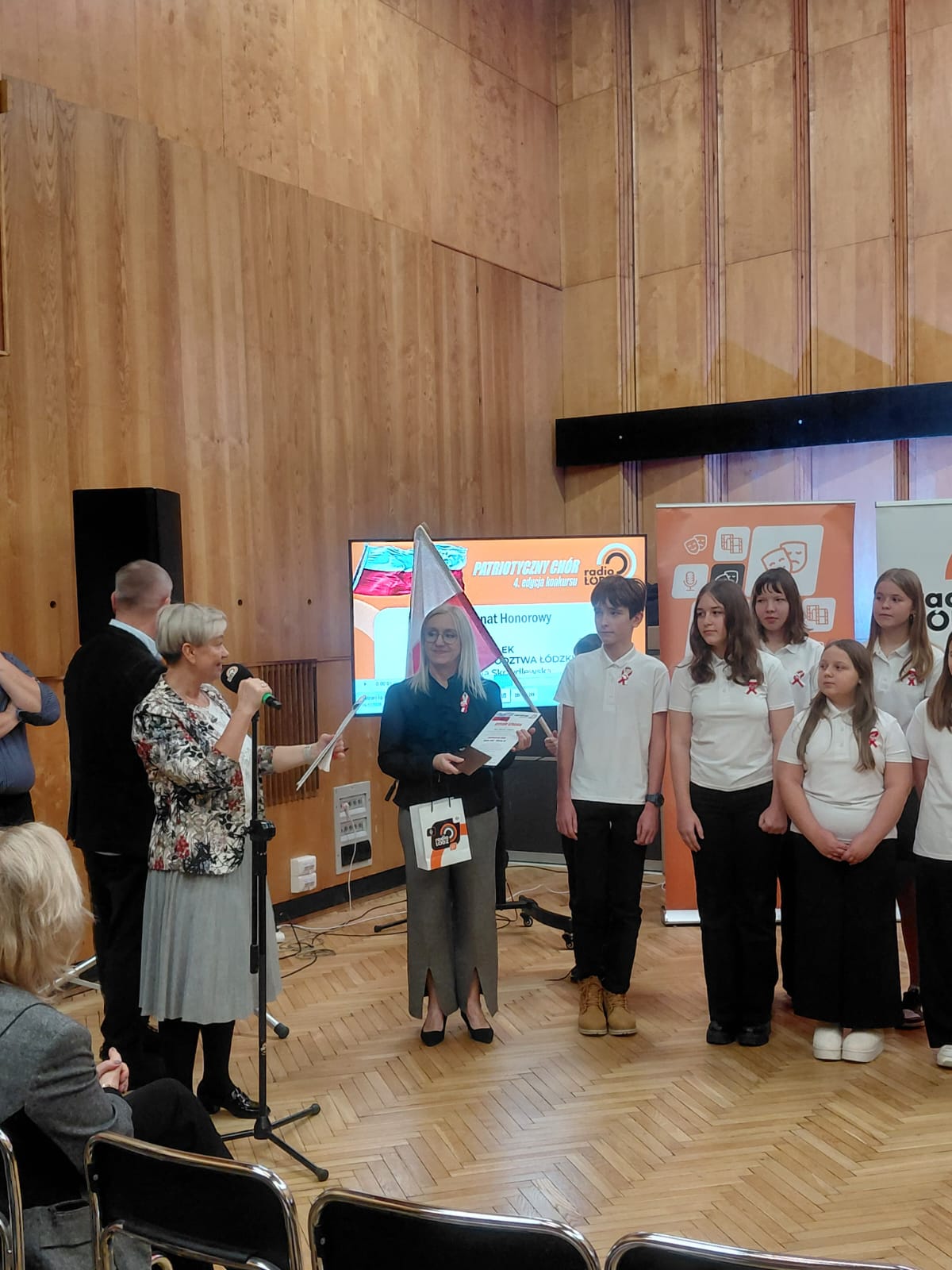 Przeżyliśmy wzruszające momenty podczas gali wręczenia nagród laureatom IV edycji Patriotycznego Chóru Radia Łódź. W dniu 25 listopada w Studiu Koncertowym im. Henryka Debicha odebraliśmy III nagrodę z rąk szefa Radia Łódź Jacka Grudnia. Jako jedyny zespół z trzech nagrodzonych nasi uczniowie wykonali pieśń o walecznych Polakach spod Monte Cassino pod dyrekcją nauczyciela muzyki Bożeny Urquidi.