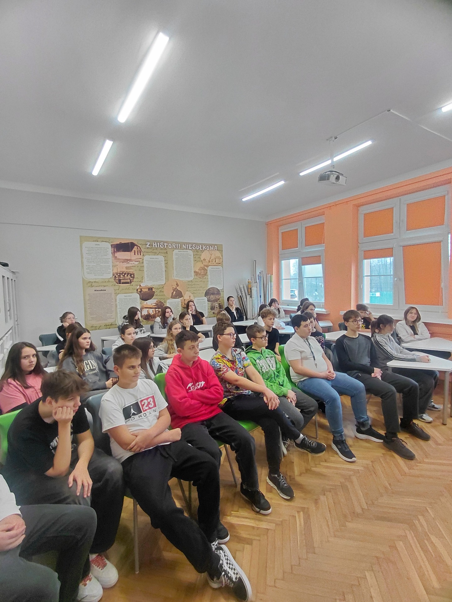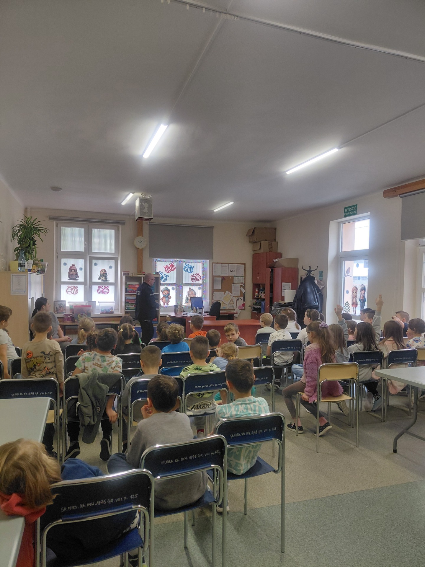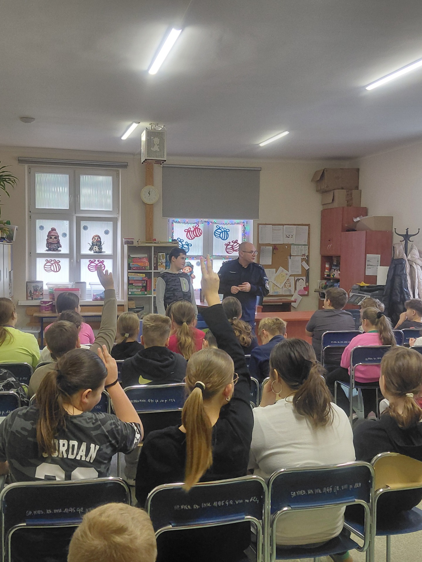 z przedstawicielem policji o bezpiecznym zachowaniu w drodze do i ze szkoły, o przechodzeniu przez ulicę, prawidłowym zachowaniu się na przejściach dla pieszych oraz korzystaniu ze środków transportu takich jak rowery i hulajnogi. Pan podkomisarz Borowski zwrócił uwagę na niebezpieczeństwa, jakie mogą czyhać na dzieci na drodze, omówił sposoby unikania lub pokonywania ich. Ponadto podkreślił, jak ważną rolę pełnią elementy odblaskowe. Dzieci wykazały się dużą wiedzą z zakresu bezpieczeństwa w ruchu drogowym odpowiadając na liczne pytania. Natomiast spotkanie naszego gościa z uczniami klas IV – VIII poruszyło nie tylko temat bezpieczeństwa na drodze, ale również w świecie cyfrowym oraz odpowiedzialności prawnej nieletnich. Uczniowie dowiedzieli się, jakie mają prawa i obowiązki w świetle prawa, kto i kiedy ponosi odpowiedzialność prawną. Funkcjonariusz policji zwrócił również uwagę na poważne konsekwencje obrażania, wyśmiewania innych osób czy udostępniania wizerunku bez zgody. Podkreślili również, że w Internecie nie ma pełnej anonimowości, a każdy użytkownik ponosi odpowiedzialność za swoje słowa i działania. Mamy nadzieję,