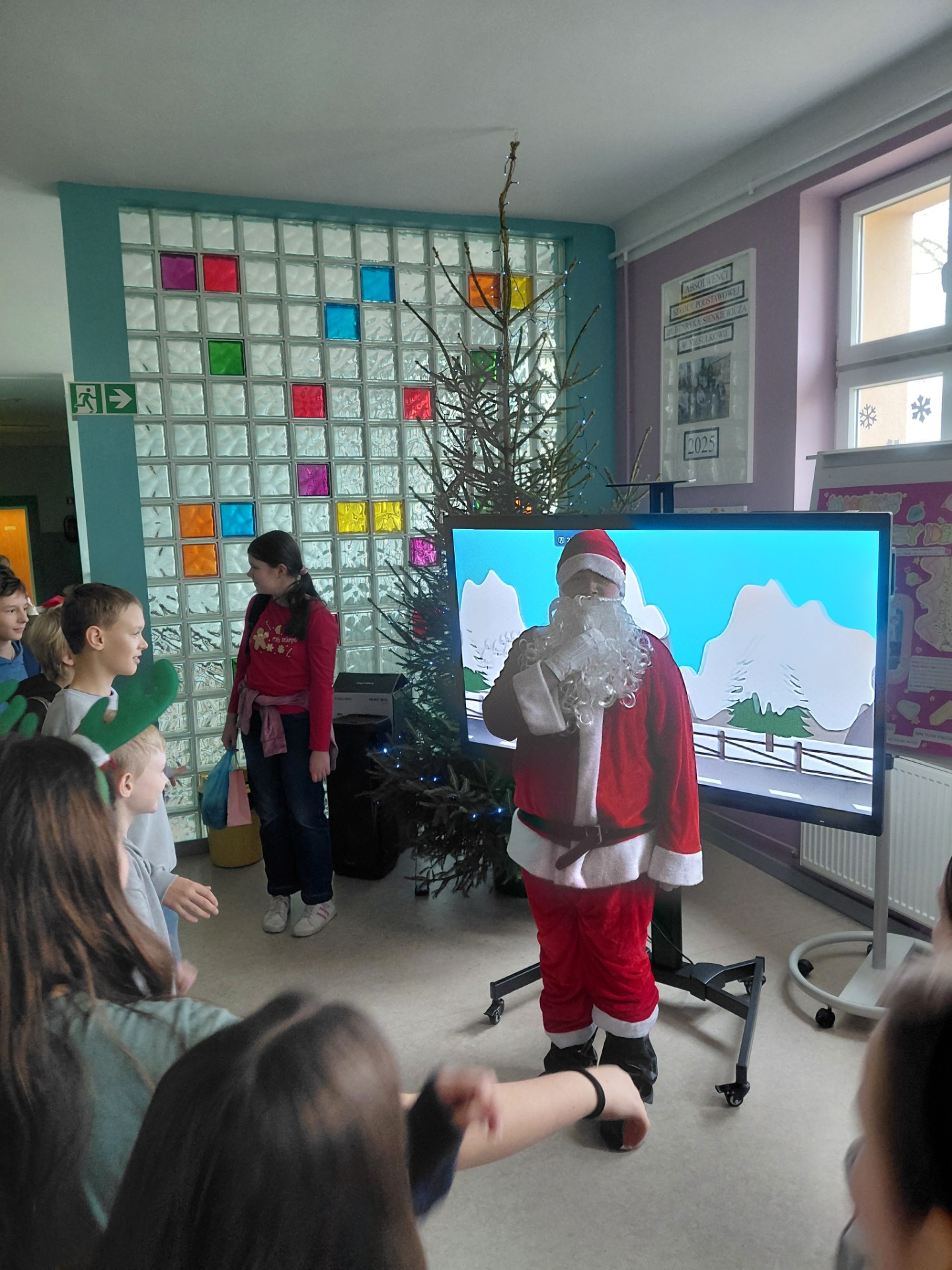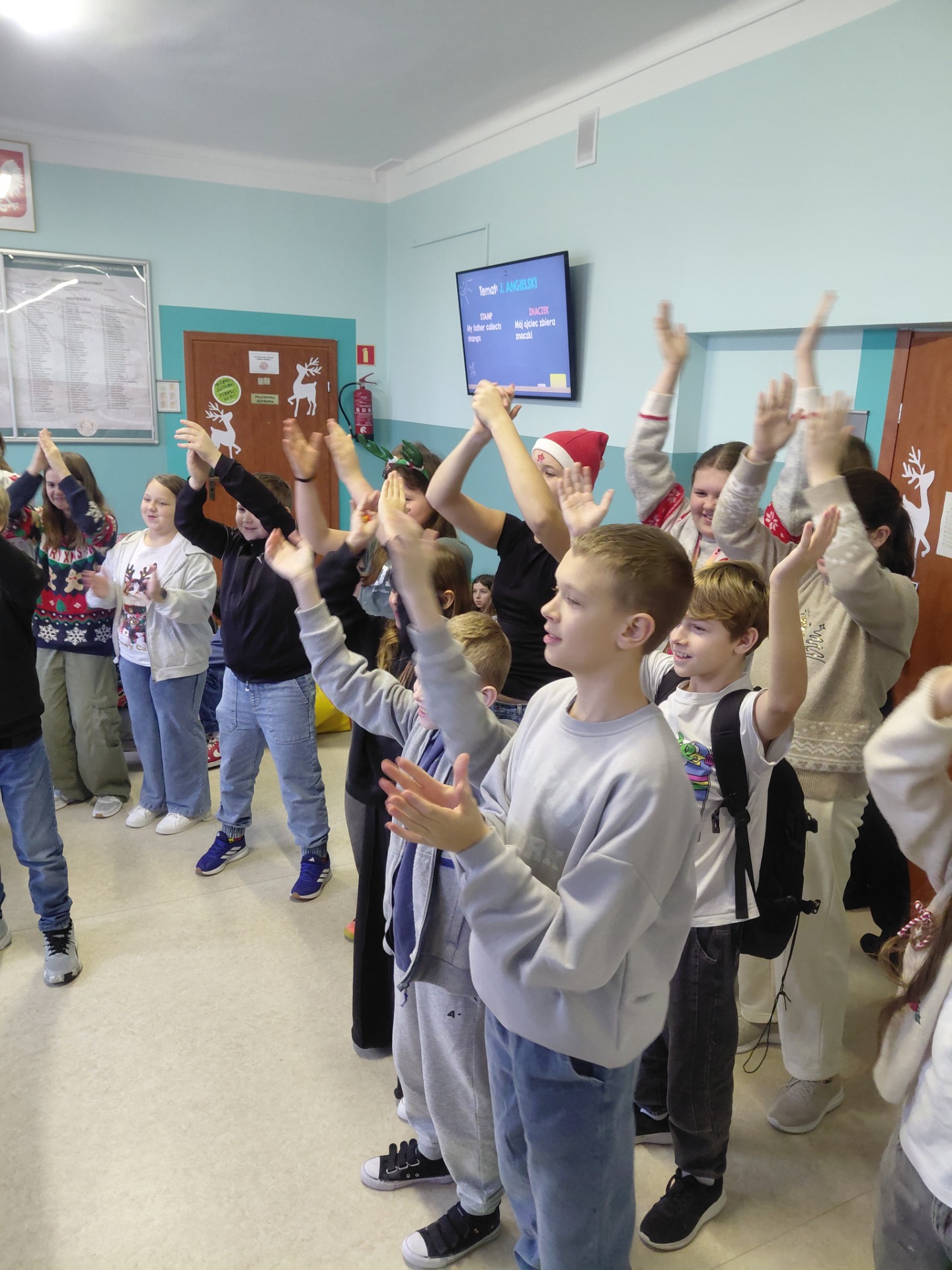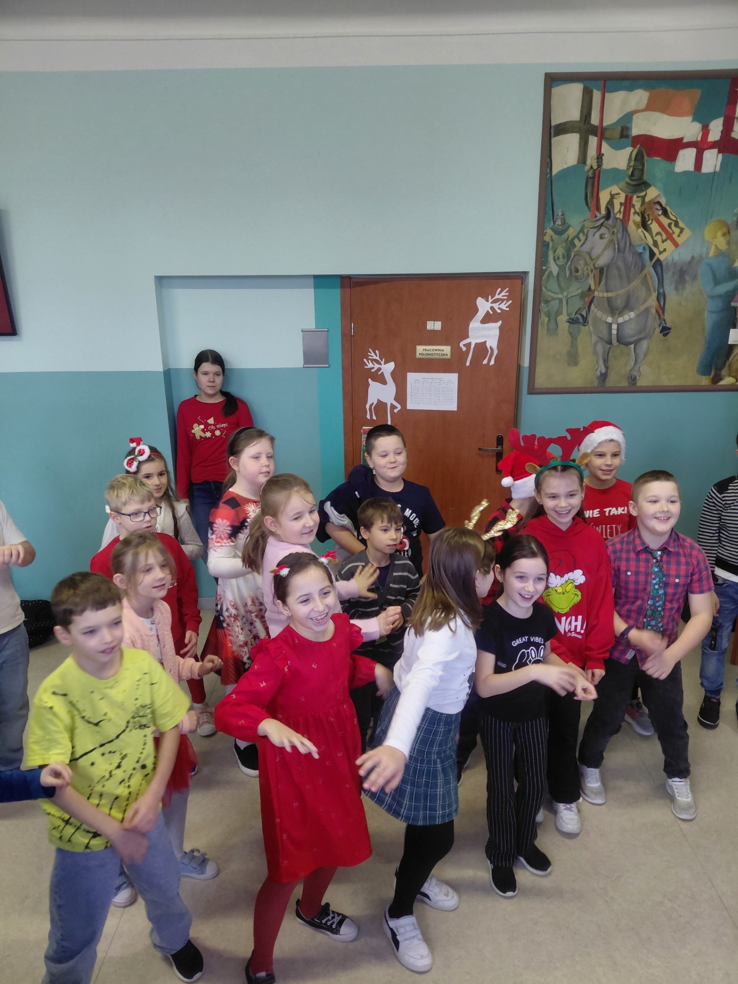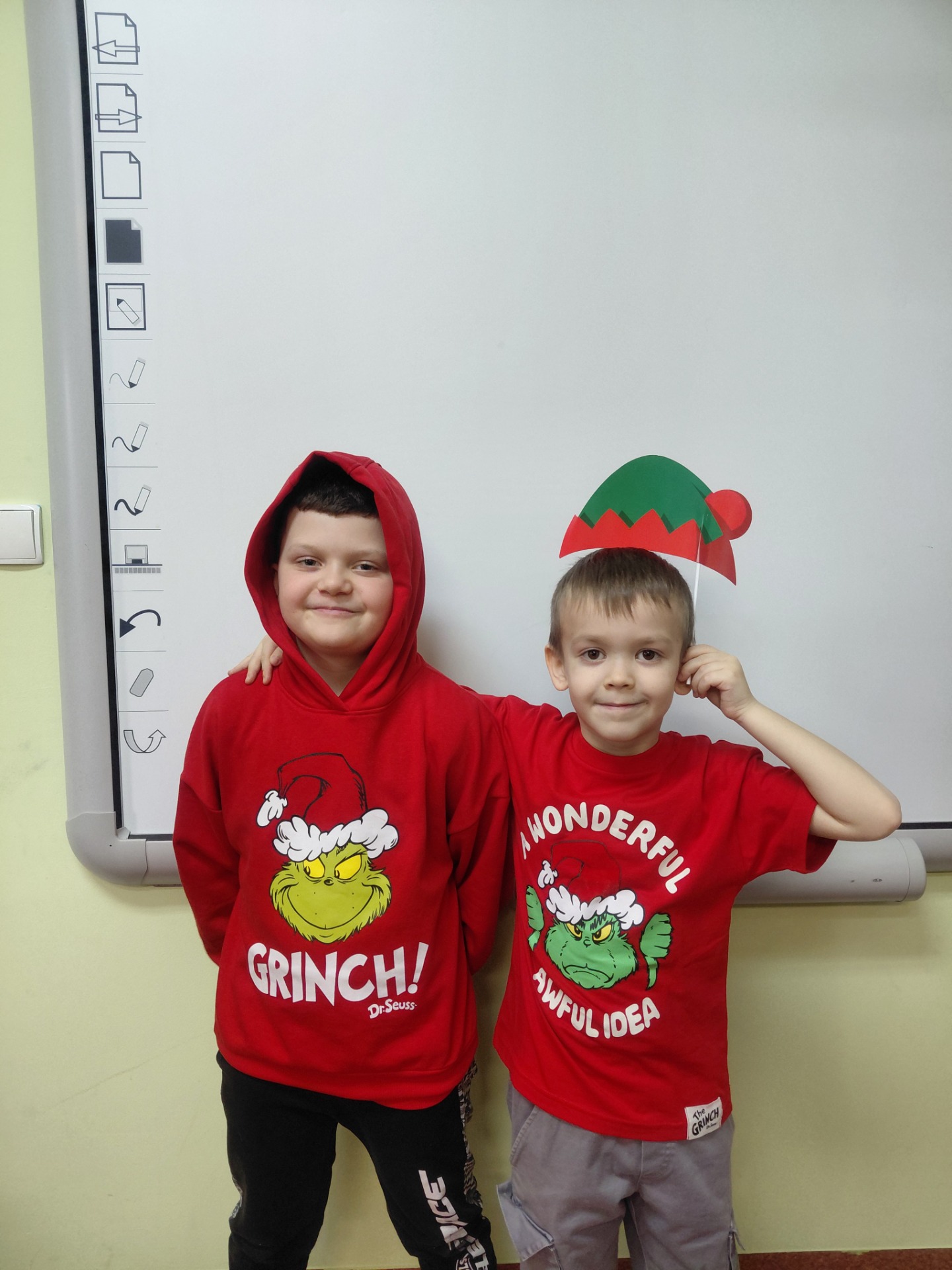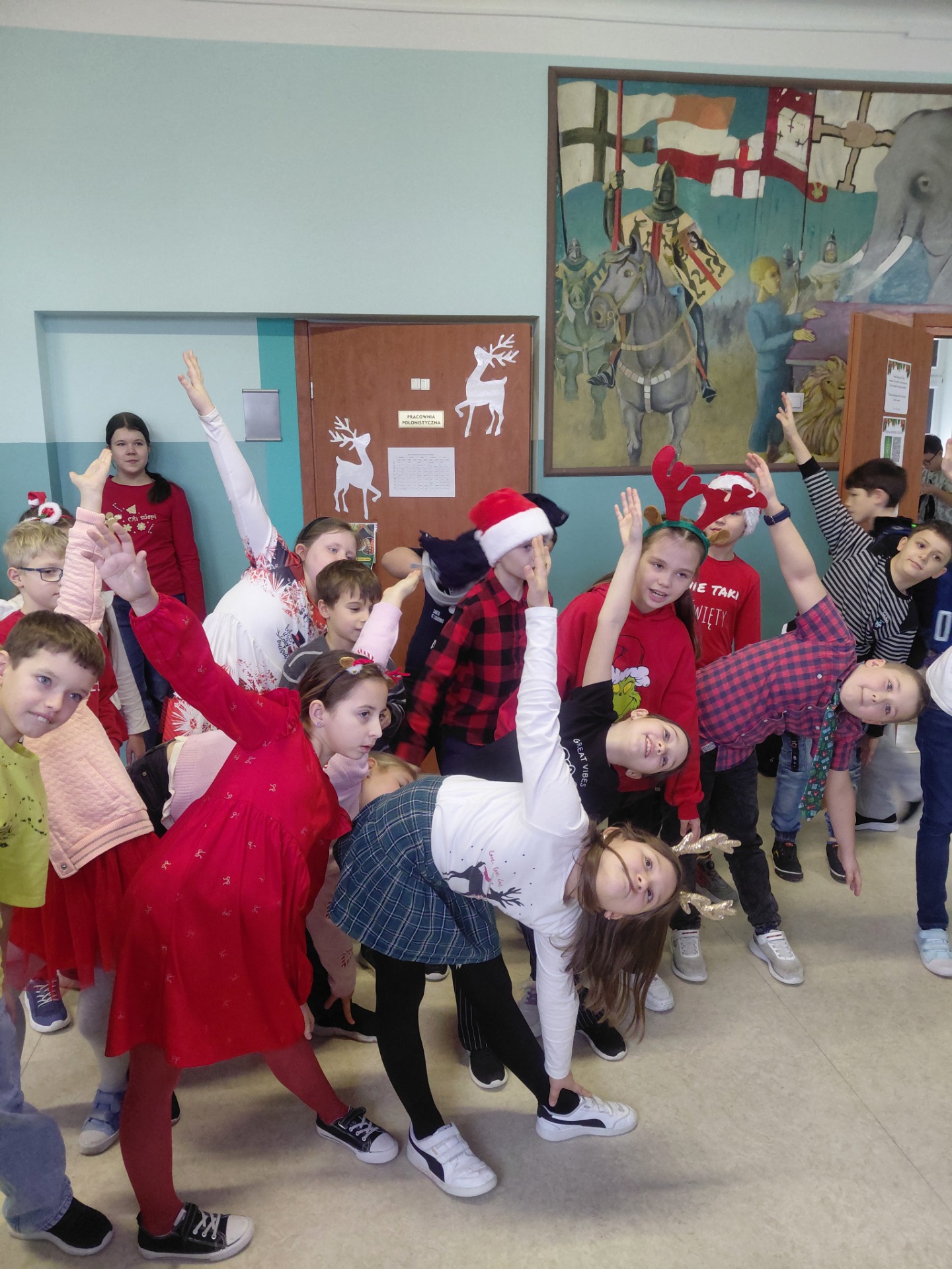 i niespodzianek. Uczniowie mogli spróbować swoich sił w quizie dotyczącym Świąt Bożego Narodzenia. Każda poprawna odpowiedź nagradzana była słodkim upominkiem, co wywoływało wiele radości. W programie nie zabrakło również atrakcji tanecznych – pojawiły się wesołe układy z udziałem Grincha w roli głównej, który tym razem postanowił bawić się razem z uczniami, zamiast psotnie psuć święta. Na szkolnych korytarzach gościł także Mikołaj, rozdając słodkie poczęstunki wszystkim, którzy napotkali go na swojej drodze. To był dzień pełen pozytywnej energii, wspólnej zabawy i świątecznego nastroju.