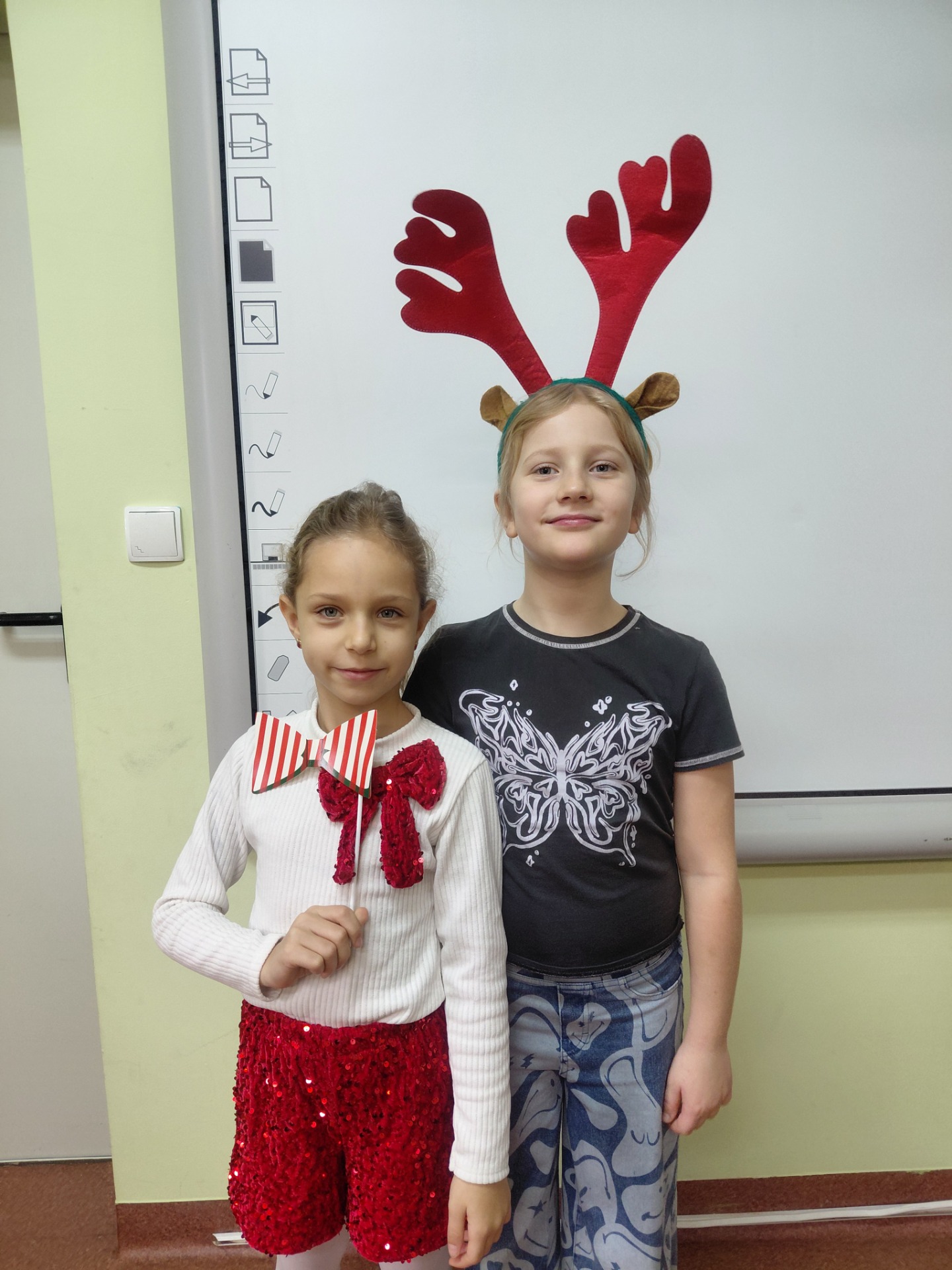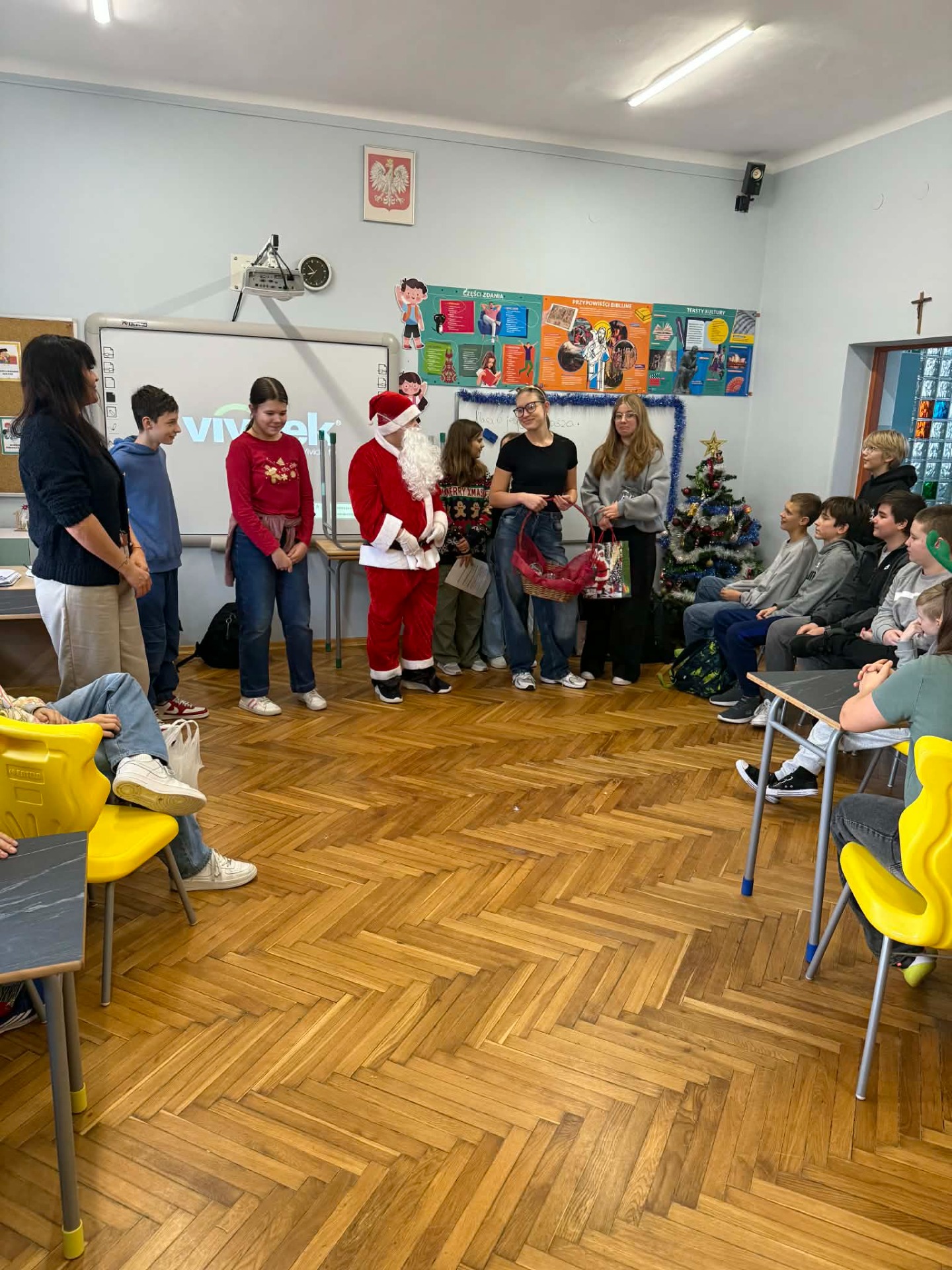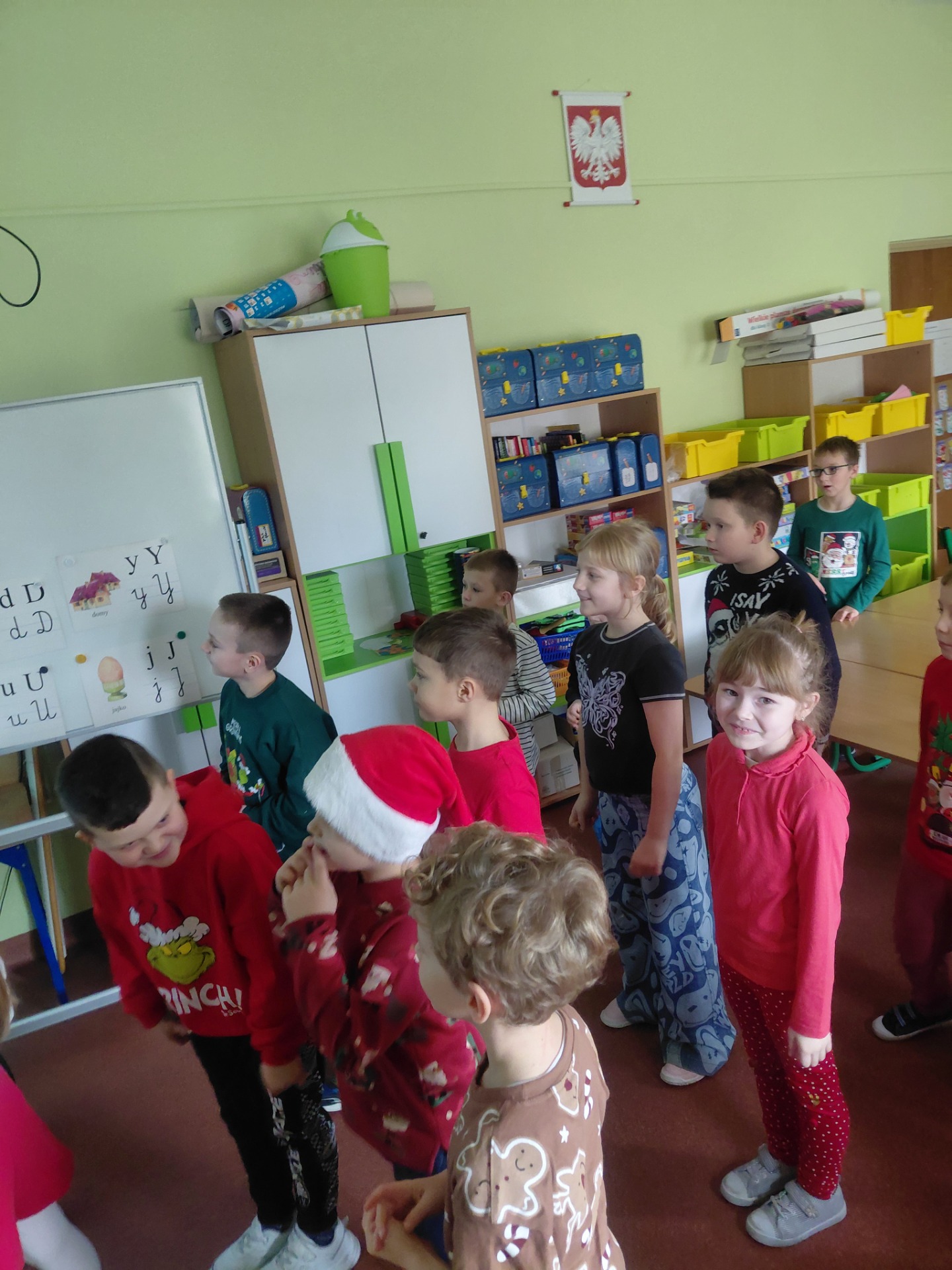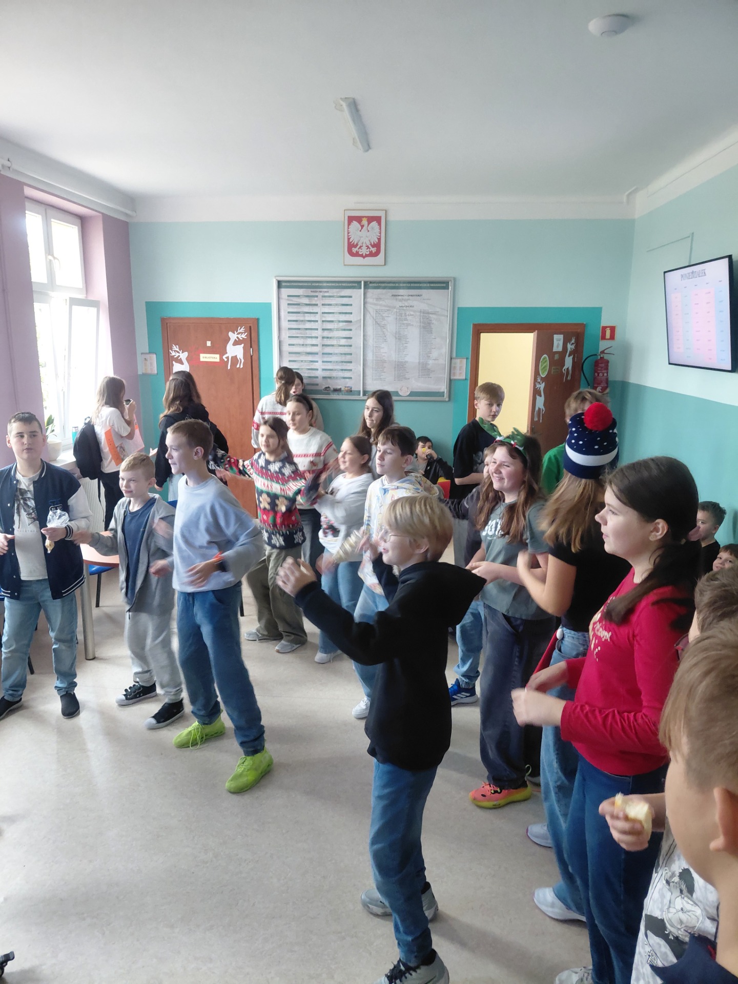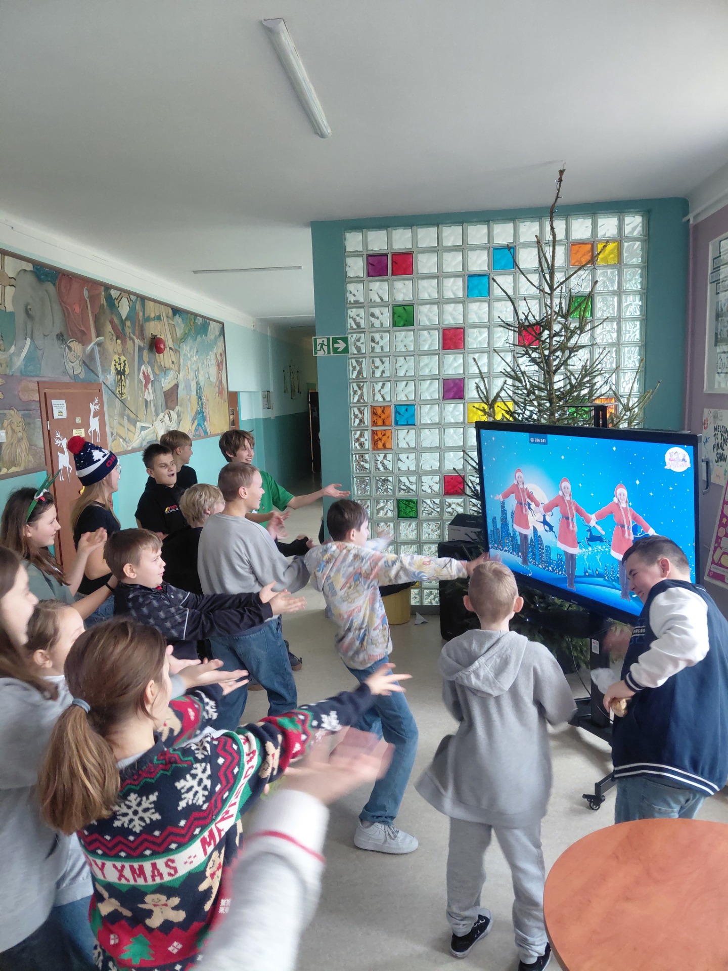 i niespodzianek. Uczniowie mogli spróbować swoich sił w quizie dotyczącym Świąt Bożego Narodzenia. Każda poprawna odpowiedź nagradzana była słodkim upominkiem, co wywoływało wiele radości. W programie nie zabrakło również atrakcji tanecznych – pojawiły się wesołe układy z udziałem Grincha w roli głównej, który tym razem postanowił bawić się razem z uczniami, zamiast psotnie psuć święta. Na szkolnych korytarzach gościł także Mikołaj, rozdając słodkie poczęstunki wszystkim, którzy napotkali go na swojej drodze. To był dzień pełen pozytywnej energii, wspólnej zabawy i świątecznego nastroju.
