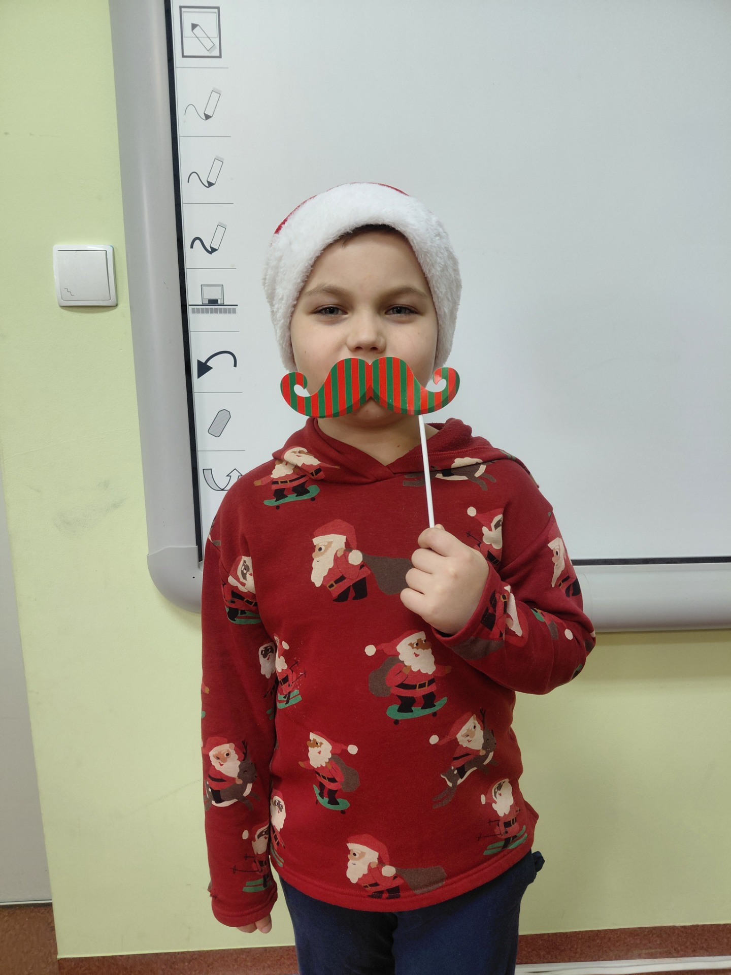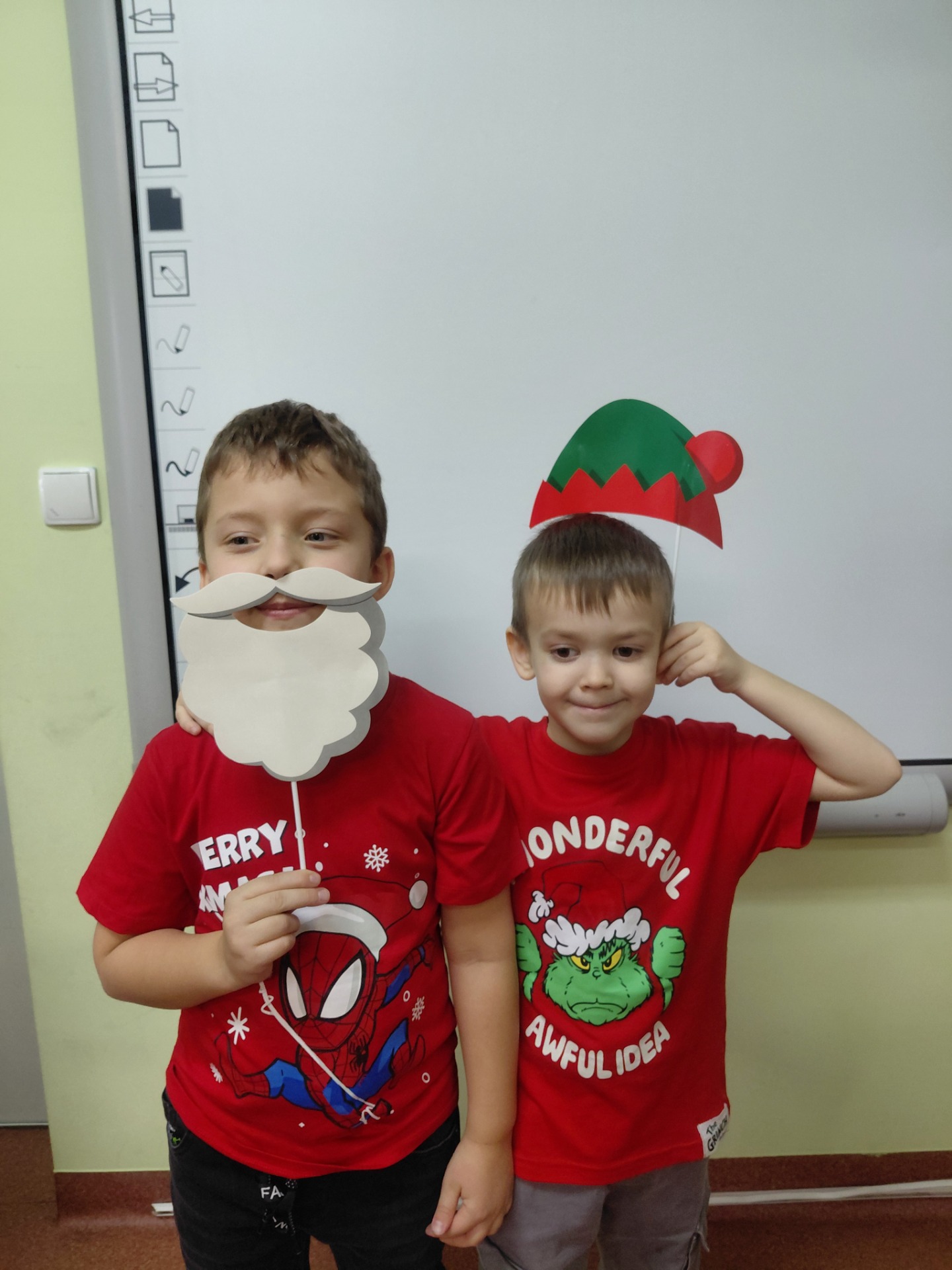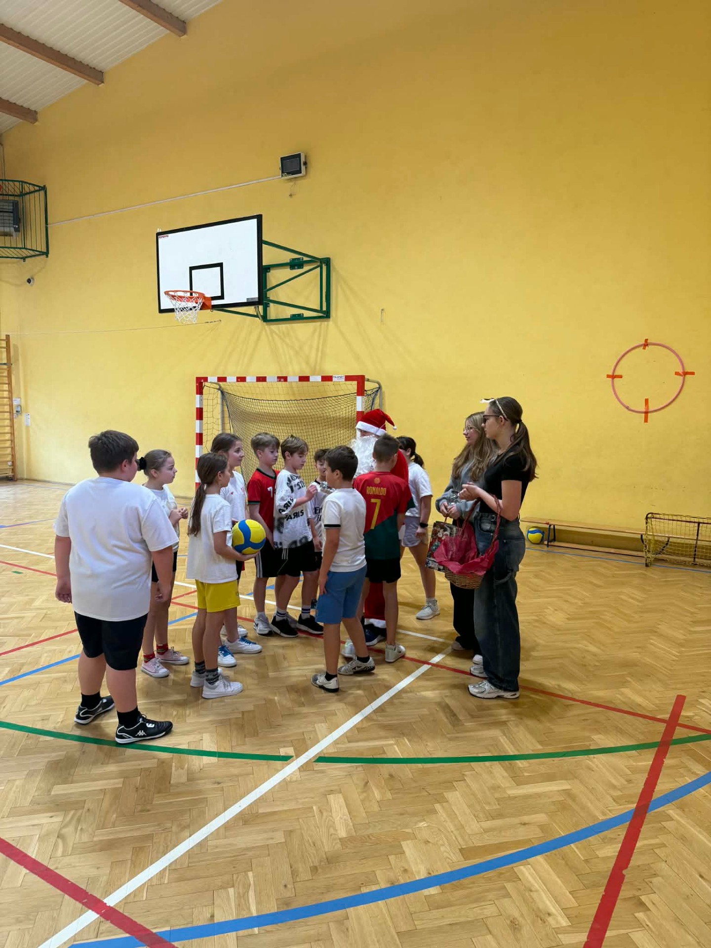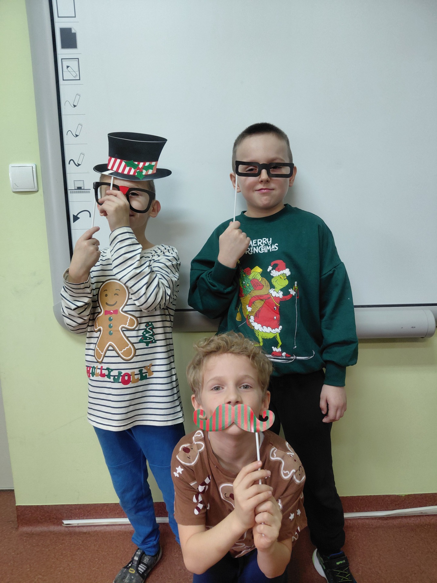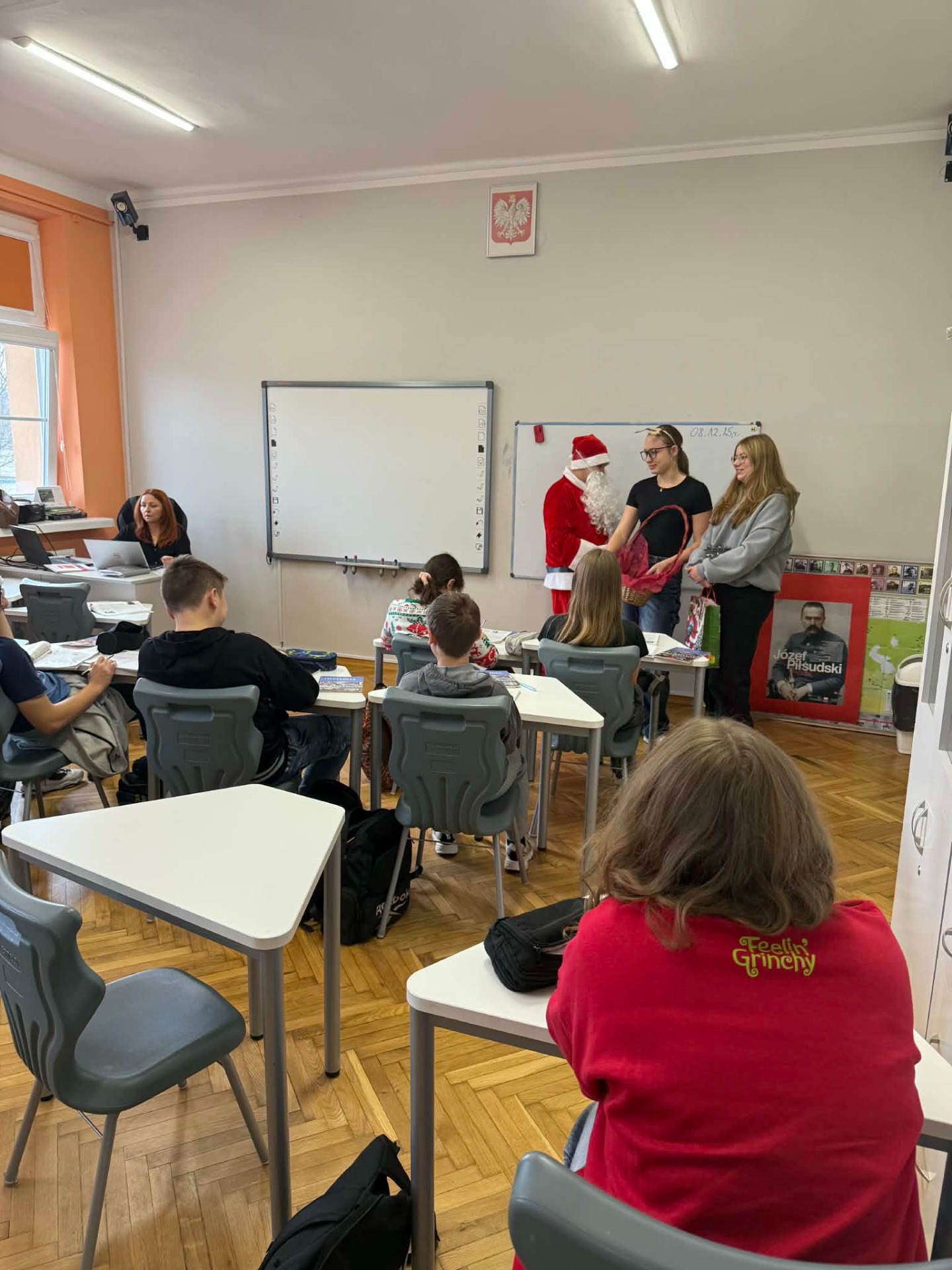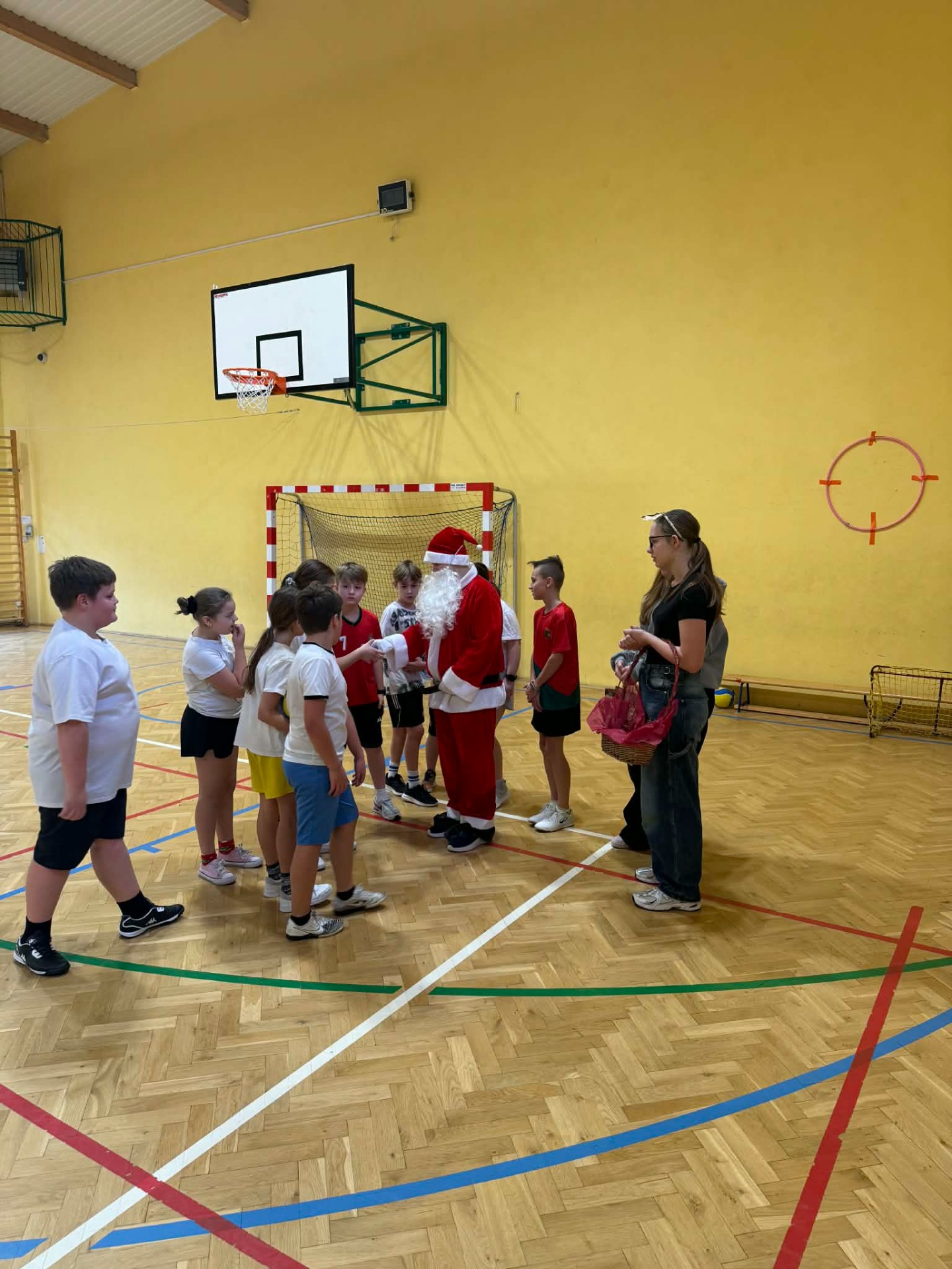 i niespodzianek. Uczniowie mogli spróbować swoich sił w quizie dotyczącym Świąt Bożego Narodzenia. Każda poprawna odpowiedź nagradzana była słodkim upominkiem, co wywoływało wiele radości. W programie nie zabrakło również atrakcji tanecznych – pojawiły się wesołe układy z udziałem Grincha w roli głównej, który tym razem postanowił bawić się razem z uczniami, zamiast psotnie psuć święta. Na szkolnych korytarzach gościł także Mikołaj, rozdając słodkie poczęstunki wszystkim, którzy napotkali go na swojej drodze. To był dzień pełen pozytywnej energii, wspólnej zabawy i świątecznego nastroju.