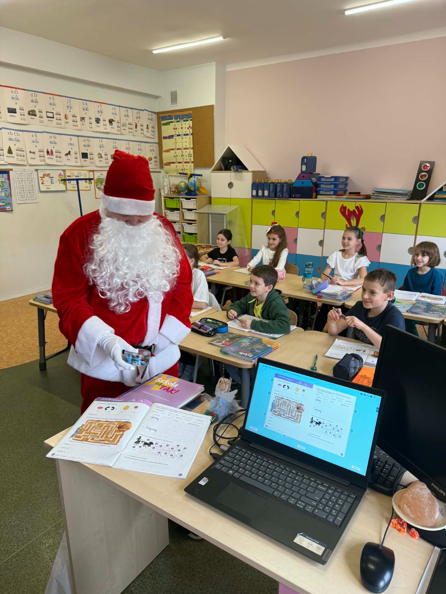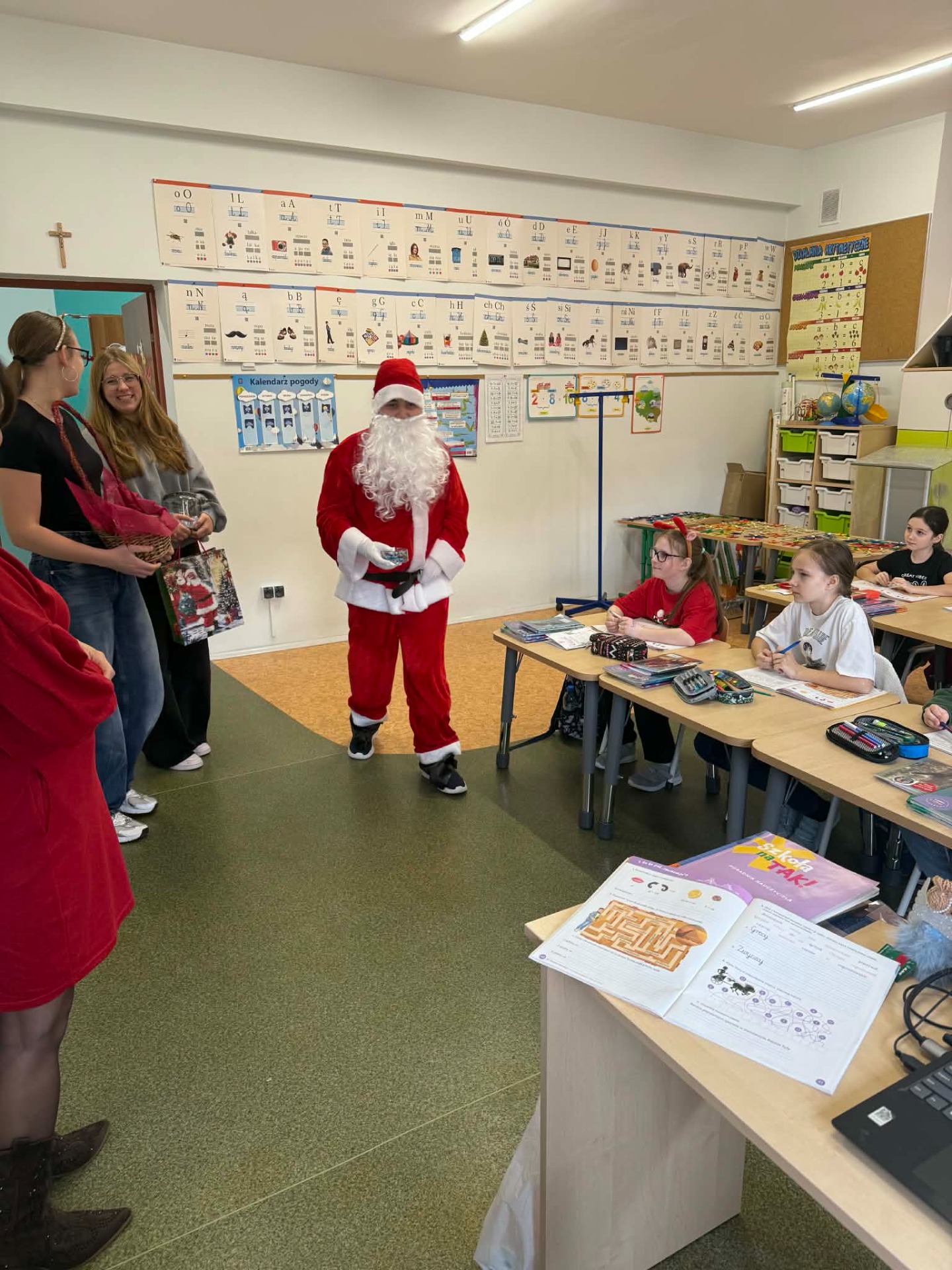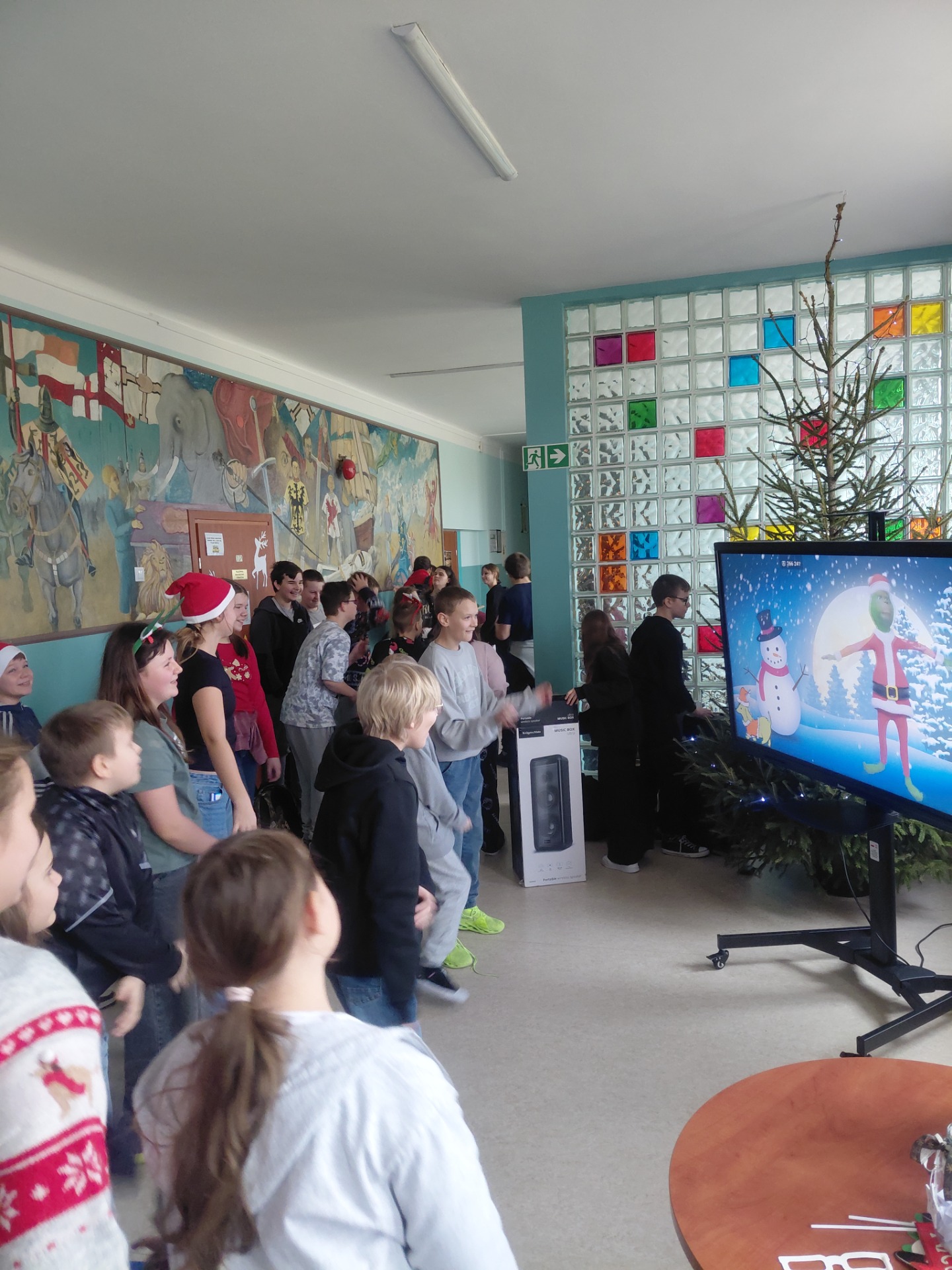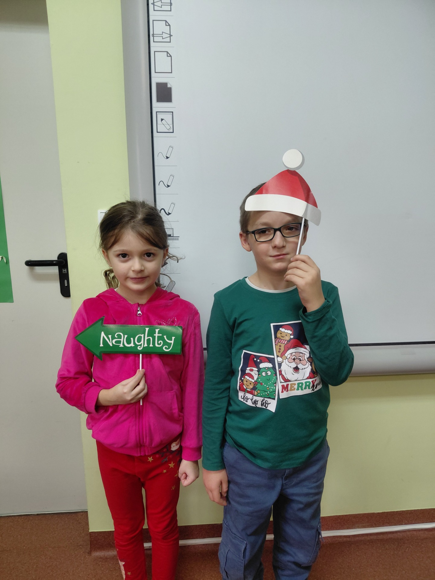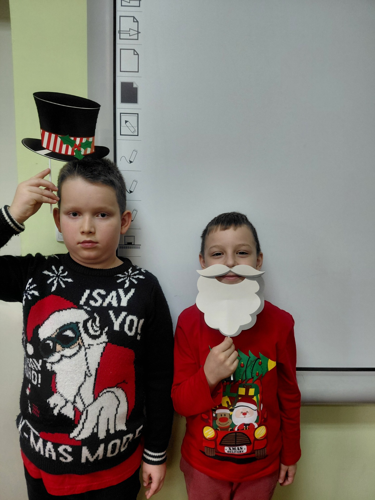 i niespodzianek. Uczniowie mogli spróbować swoich sił w quizie dotyczącym Świąt Bożego Narodzenia. Każda poprawna odpowiedź nagradzana była słodkim upominkiem, co wywoływało wiele radości. W programie nie zabrakło również atrakcji tanecznych – pojawiły się wesołe układy z udziałem Grincha w roli głównej, który tym razem postanowił bawić się razem z uczniami, zamiast psotnie psuć święta. Na szkolnych korytarzach gościł także Mikołaj, rozdając słodkie poczęstunki wszystkim, którzy napotkali go na swojej drodze. To był dzień pełen pozytywnej energii, wspólnej zabawy i świątecznego nastroju.