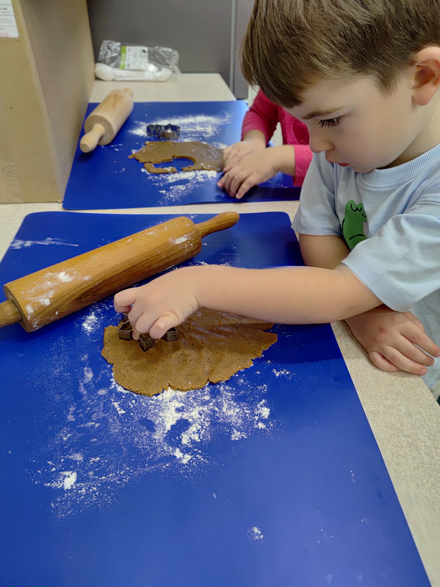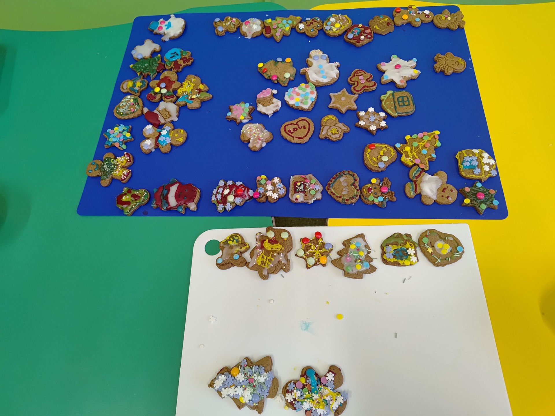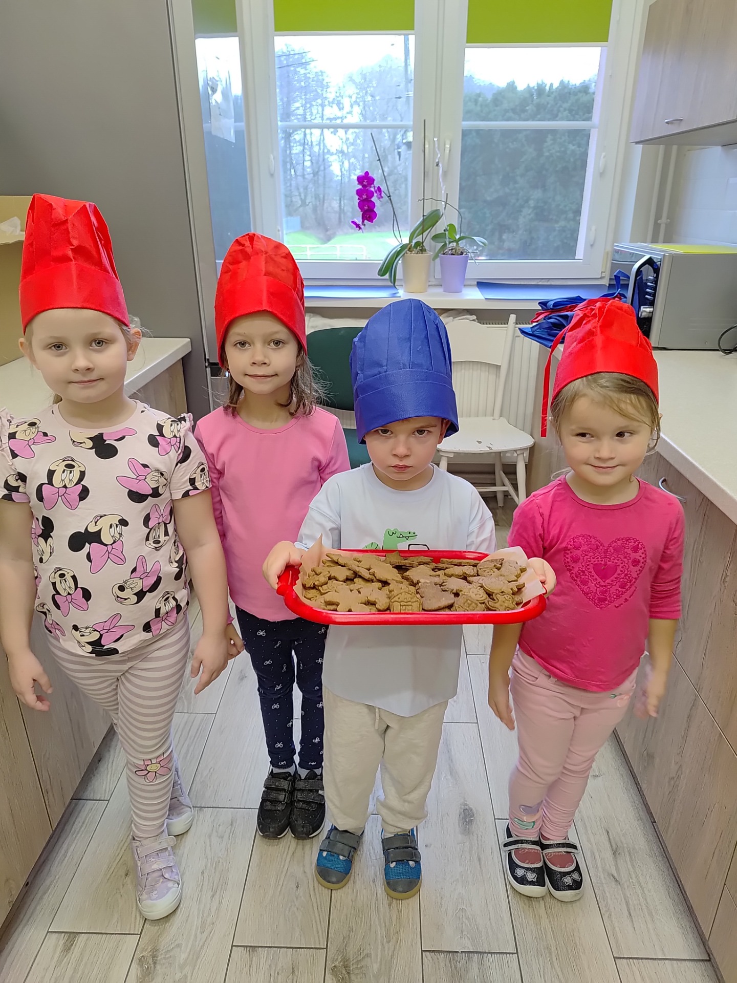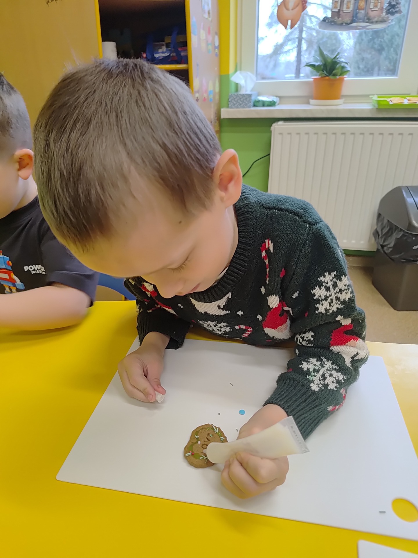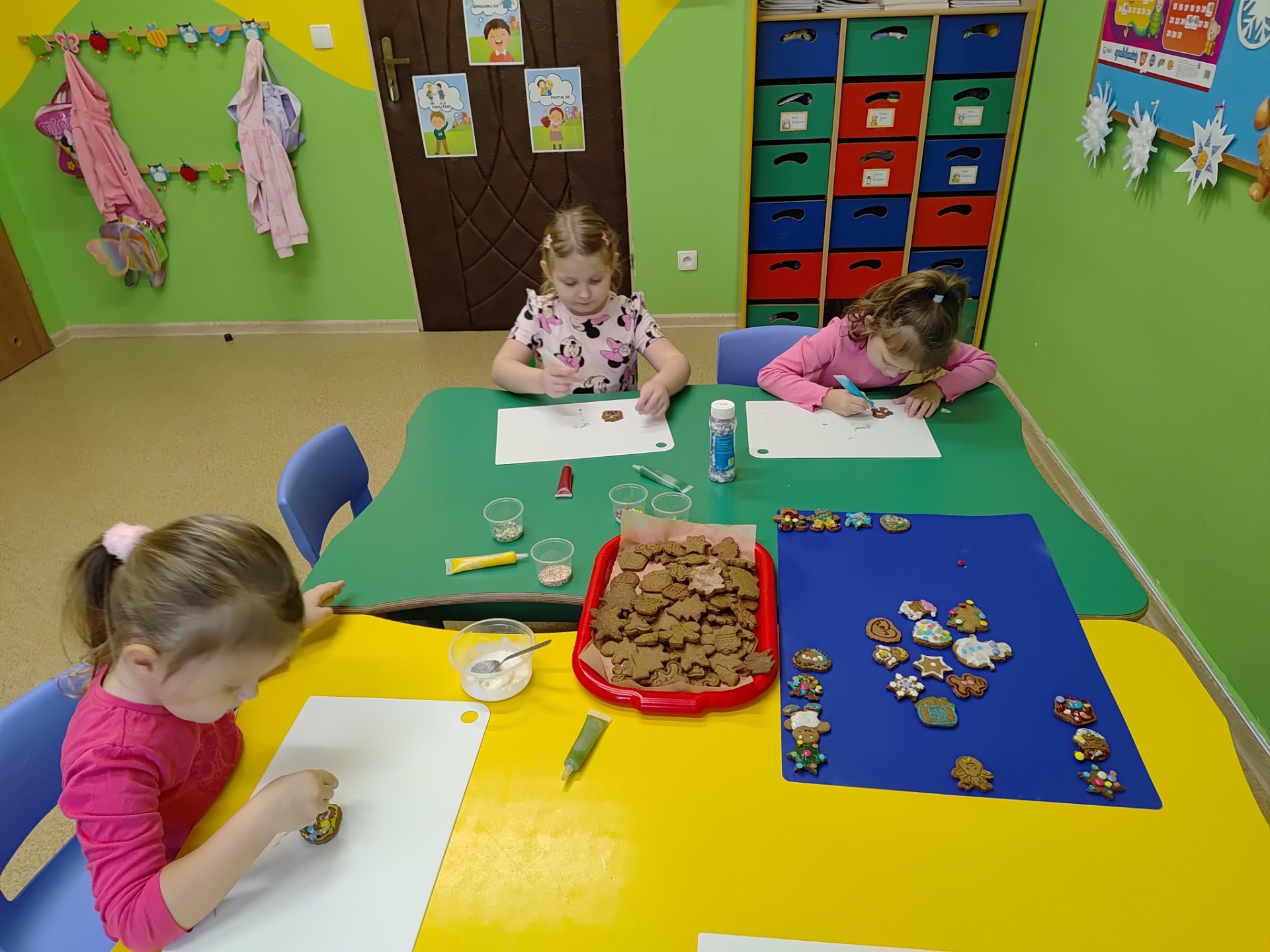Przedszkolaki z wielkim zaangażowaniem wałkowały ciasto, wykrawały pierniczki w kształcie gwiazdek, serduszek i choinek, a następnie z niecierpliwością czekały na ich upieczenie. Najwięcej radości sprawiło dzieciom dekorowanie gotowych ciasteczek kolorowym lukrem, posypkami i pisakami. Każdy pierniczek był wyjątkowy i odzwierciedlał dziecięcą kreatywność.