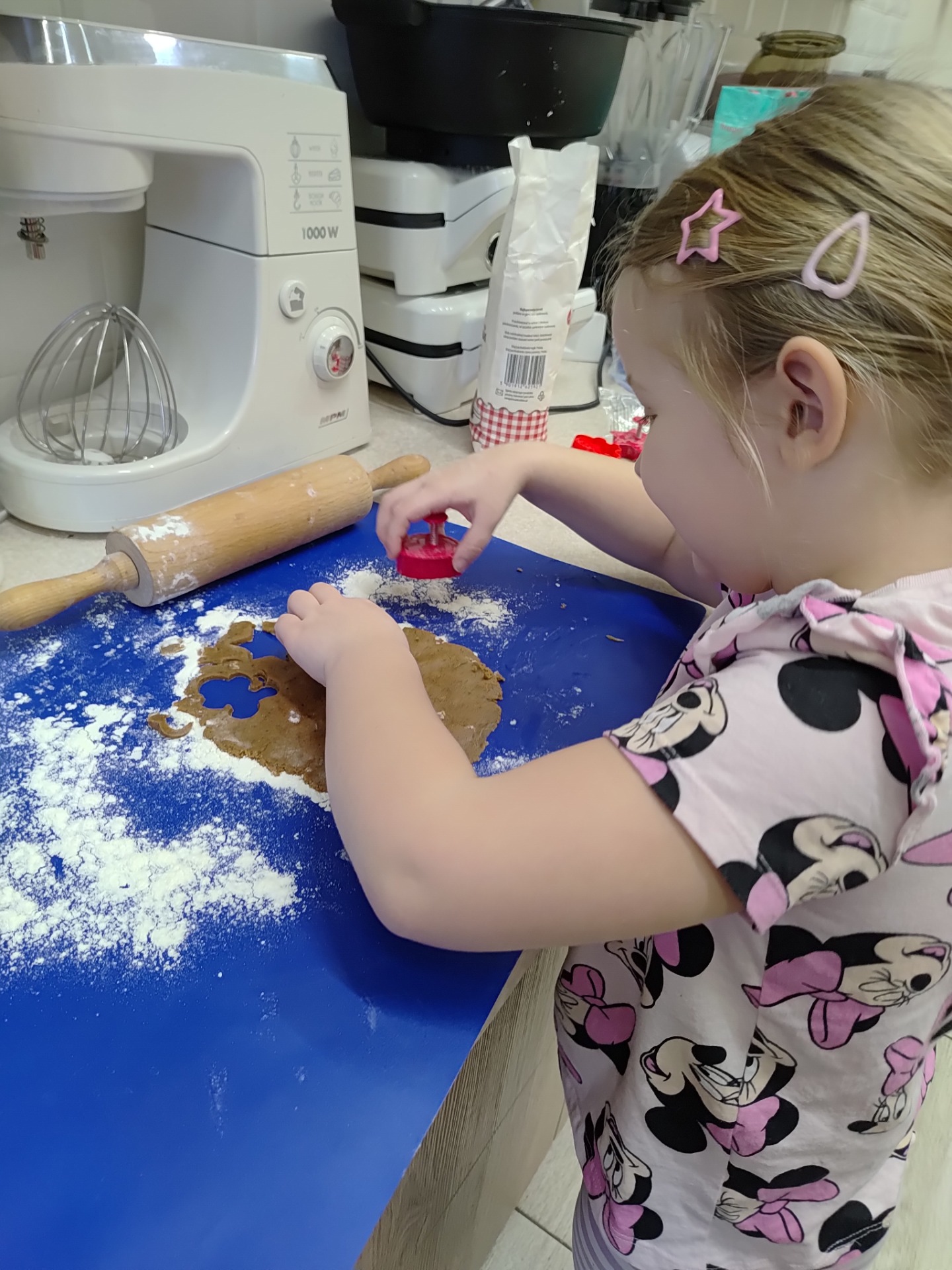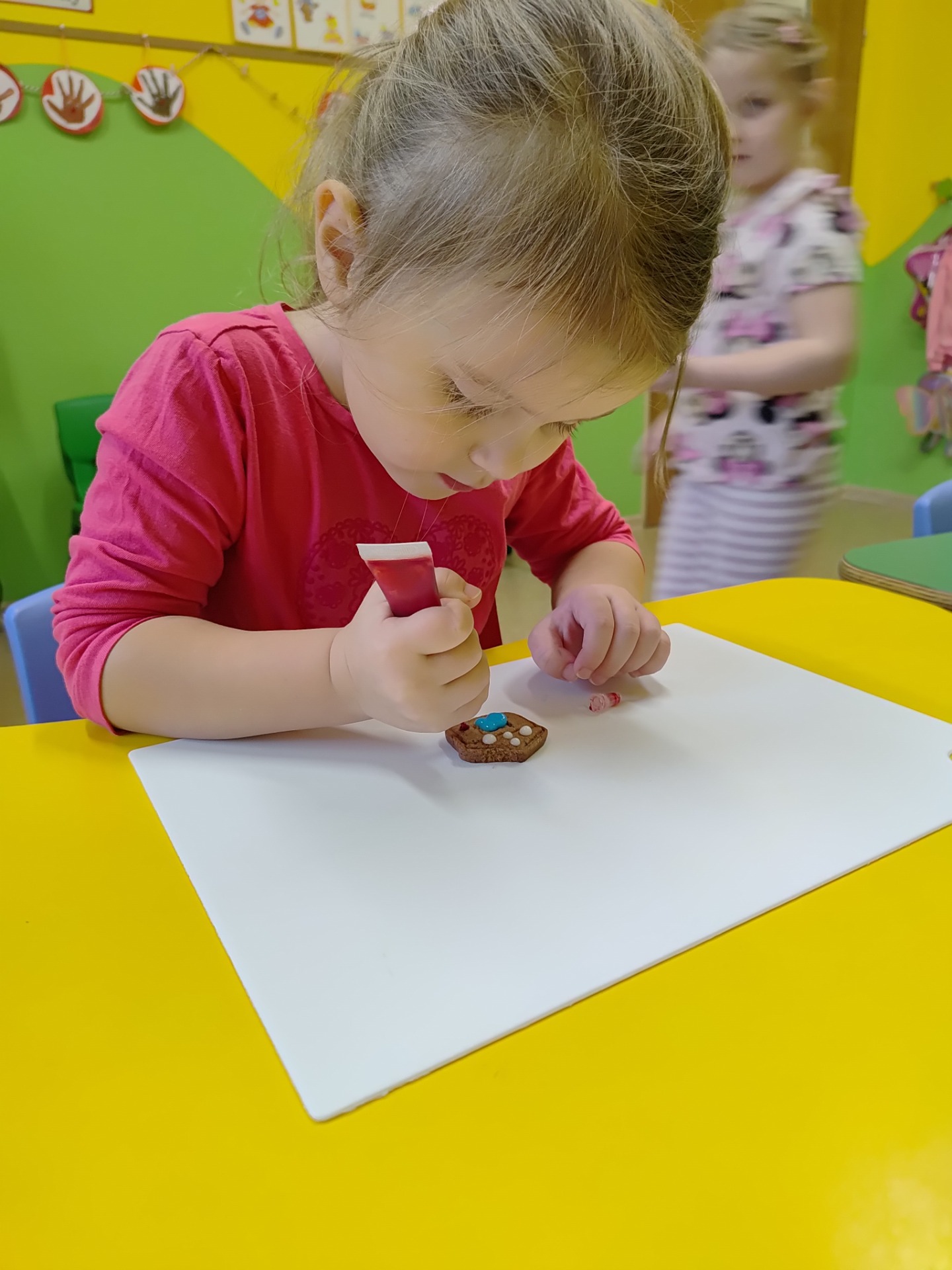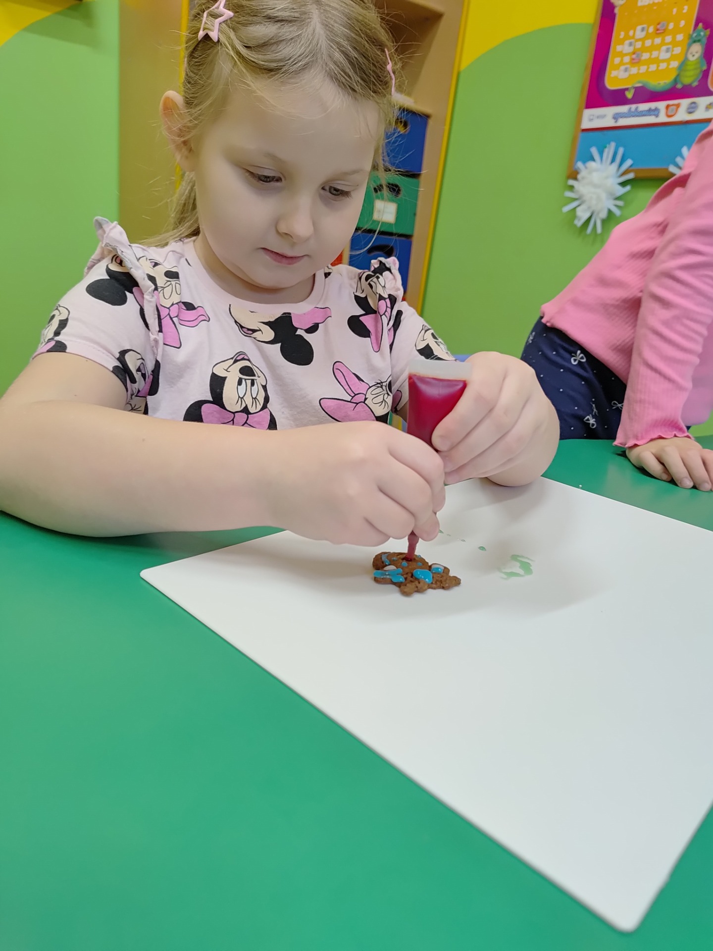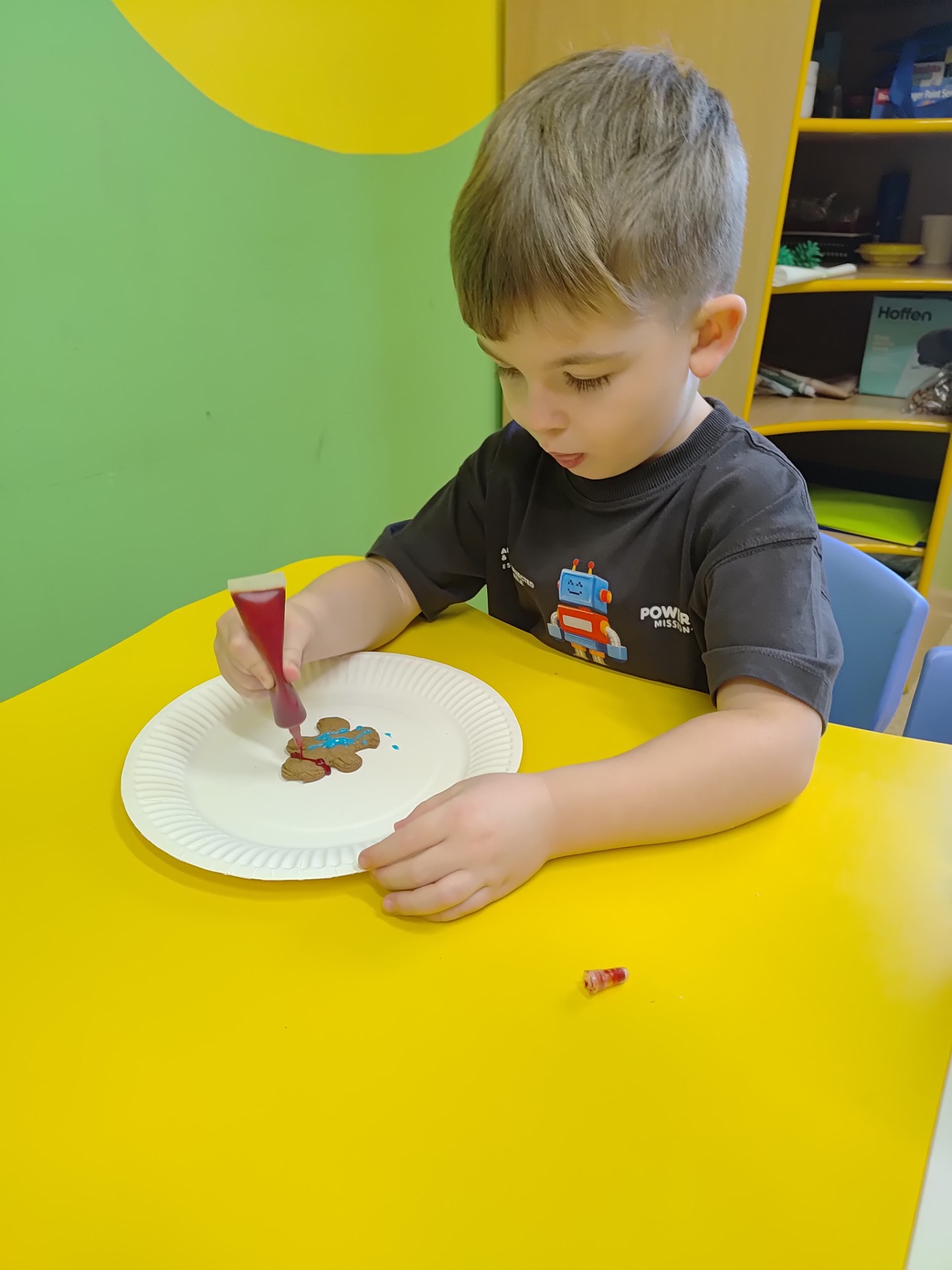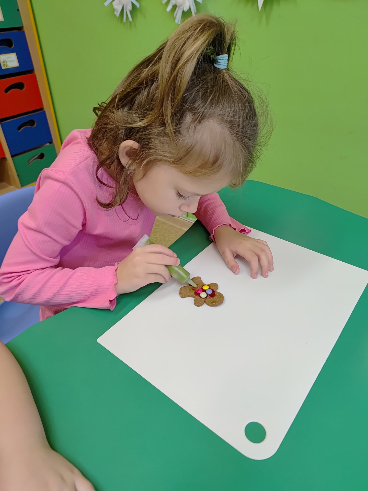 Przedszkolaki z wielkim zaangażowaniem wałkowały ciasto, wykrawały pierniczki w kształcie gwiazdek, serduszek i choinek, a następnie z niecierpliwością czekały na ich upieczenie. Najwięcej radości sprawiło dzieciom dekorowanie gotowych ciasteczek kolorowym lukrem, posypkami i pisakami. Każdy pierniczek był wyjątkowy i odzwierciedlał dziecięcą kreatywność.
