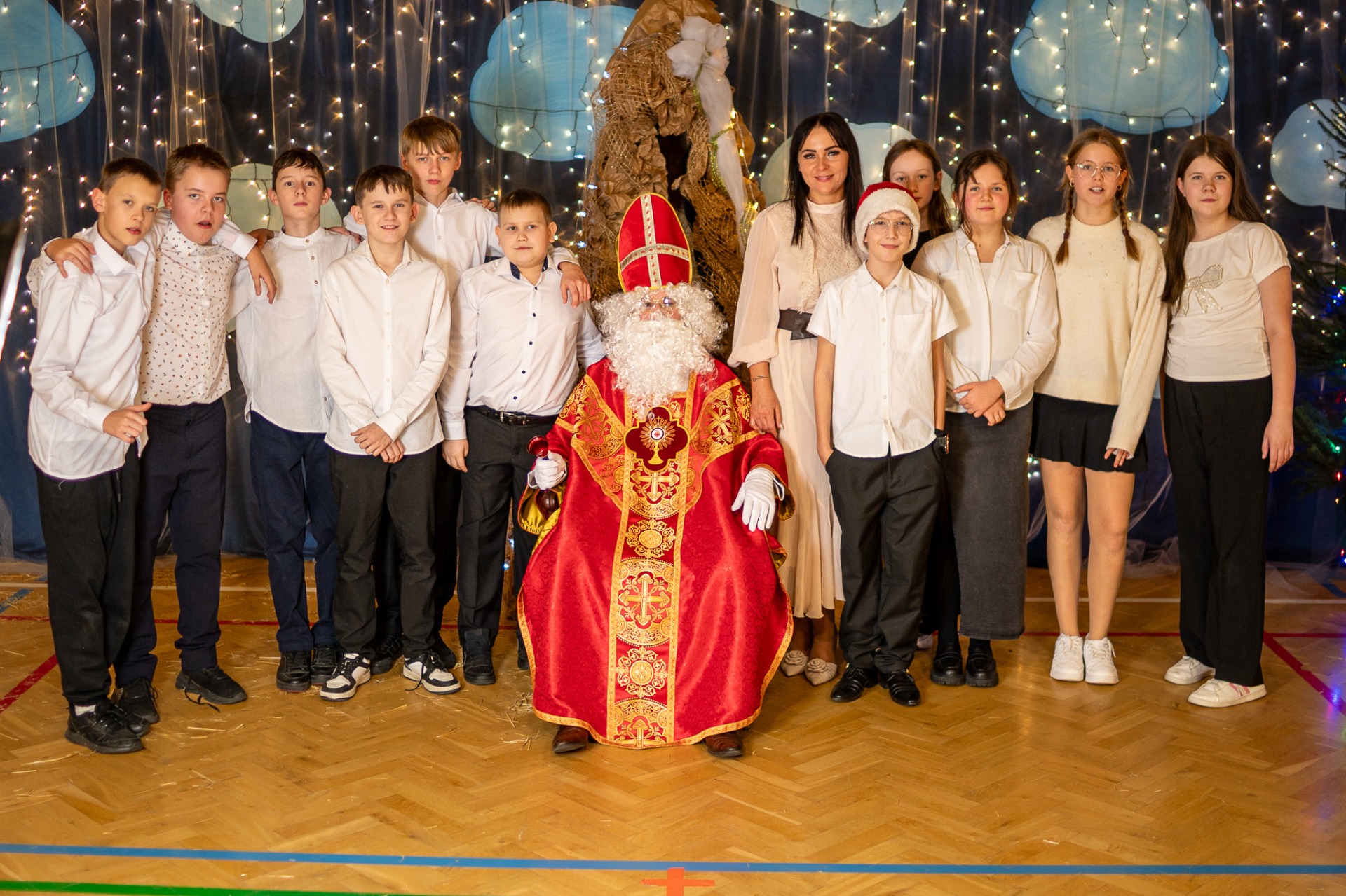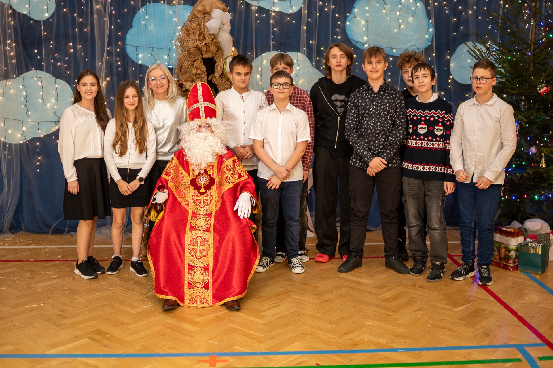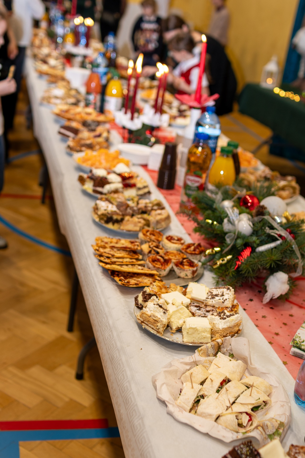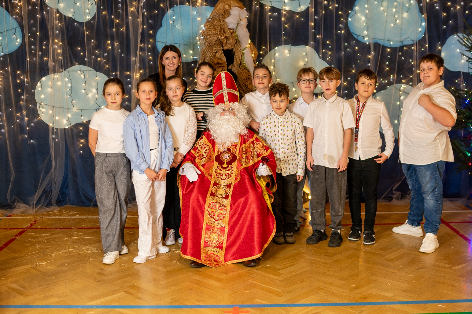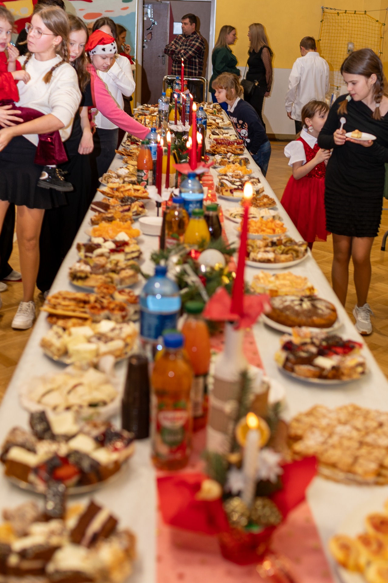 Centralnym punktem wieczoru były Jasełka, przygotowane przez szkolną grupę teatralną. Młodzi aktorzy zaprezentowali się z ogromnym zaangażowaniem, a ich występ został nagrodzony gromkimi brawami. Niezwykłe wrażenie zrobił również szkolny chór, który wspaniale wykonał nieznane wcześniej widowni pastorałki, wprowadzając wszystkich w nastrojowy, refleksyjny klimat. Podczas wieczoru każda klasa oraz przedszkolaki zaprezentowali przygotowaną kolędę lub pastorałkę. Różnorodność wykonań, dziecięca radość i szczerość występów sprawiły, że na widowni nie brakowało wzruszeń i uśmiechów. Ogromną atrakcją dla najmłodszych – i nie tylko – była wizyta prawdziwego św. Mikołaja. W specjalnie przygotowanym pokoju św. Mikołaja każdy mógł zrobić pamiątkowe zdjęcie: indywidualne, rodzinne lub z przyjaciółmi. Nie zabrakło także czegoś dla ciała – rodzice przygotowali pyszny, świąteczny poczęstunek, który dopełnił ten wyjątkowy wieczór i sprzyjał dalszym rozmowom oraz wspólnemu spędzaniu czasu.
