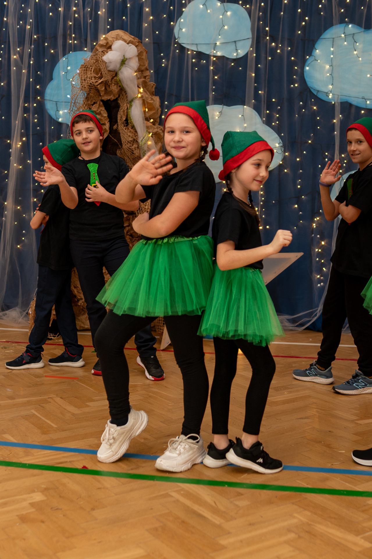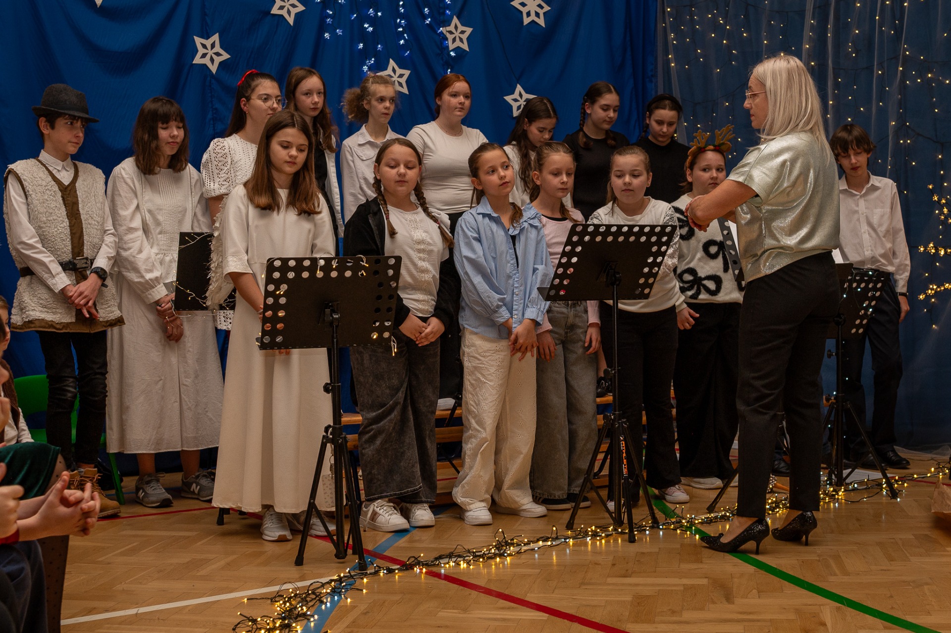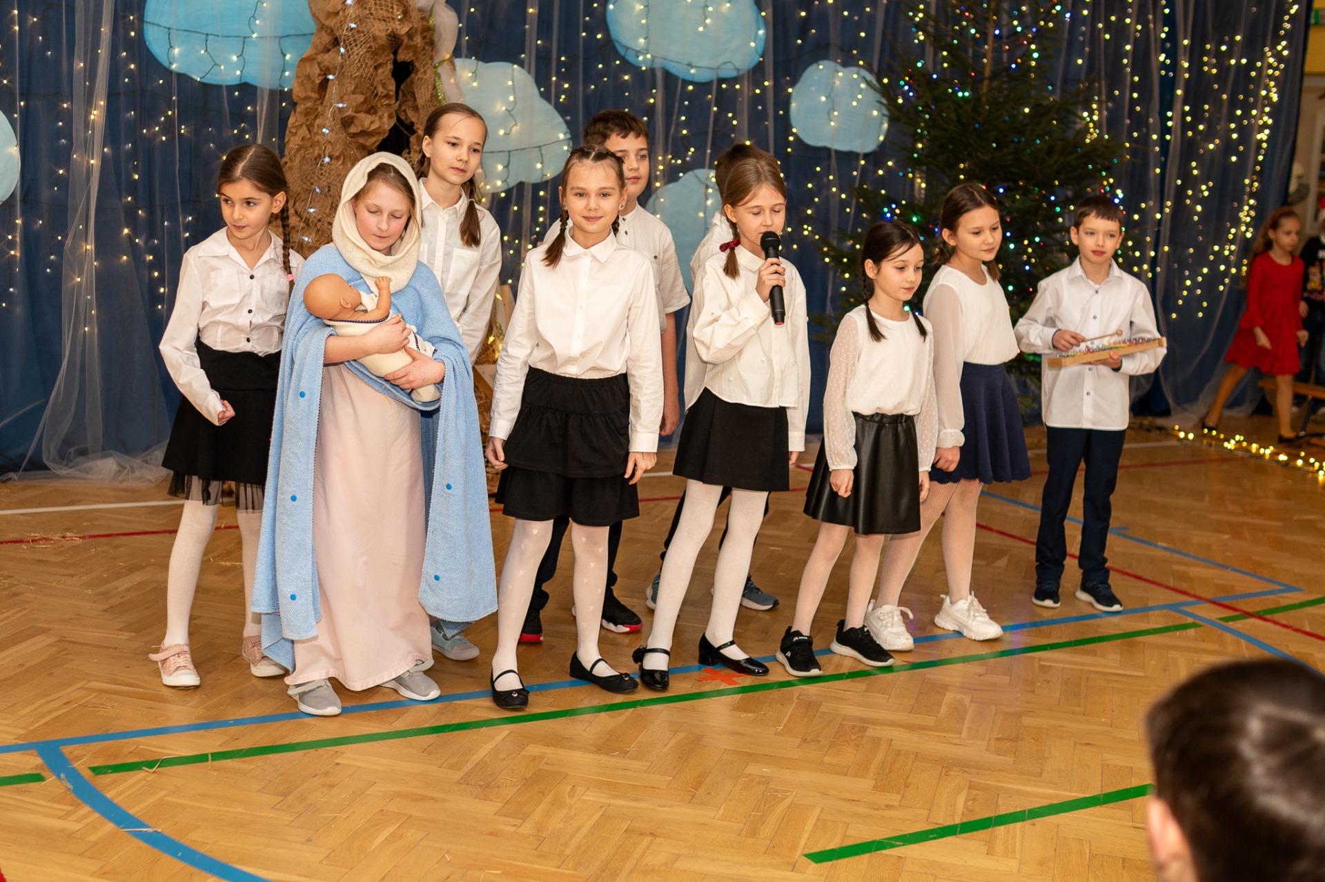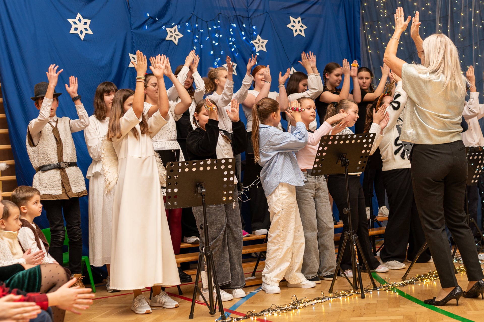 Centralnym punktem wieczoru były Jasełka, przygotowane przez szkolną grupę teatralną. Młodzi aktorzy zaprezentowali się z ogromnym zaangażowaniem, a ich występ został nagrodzony gromkimi brawami. Niezwykłe wrażenie zrobił również szkolny chór, który wspaniale wykonał nieznane wcześniej widowni pastorałki, wprowadzając wszystkich w nastrojowy, refleksyjny klimat. Podczas wieczoru każda klasa oraz przedszkolaki zaprezentowali przygotowaną kolędę lub pastorałkę. Różnorodność wykonań, dziecięca radość i szczerość występów sprawiły, że na widowni nie brakowało wzruszeń i uśmiechów. Ogromną atrakcją dla najmłodszych – i nie tylko – była wizyta prawdziwego św. Mikołaja. W specjalnie przygotowanym pokoju św. Mikołaja każdy mógł zrobić pamiątkowe zdjęcie: indywidualne, rodzinne lub z przyjaciółmi. Nie zabrakło także czegoś dla ciała – rodzice przygotowali pyszny, świąteczny poczęstunek, który dopełnił ten wyjątkowy wieczór i sprzyjał dalszym rozmowom oraz wspólnemu spędzaniu czasu.