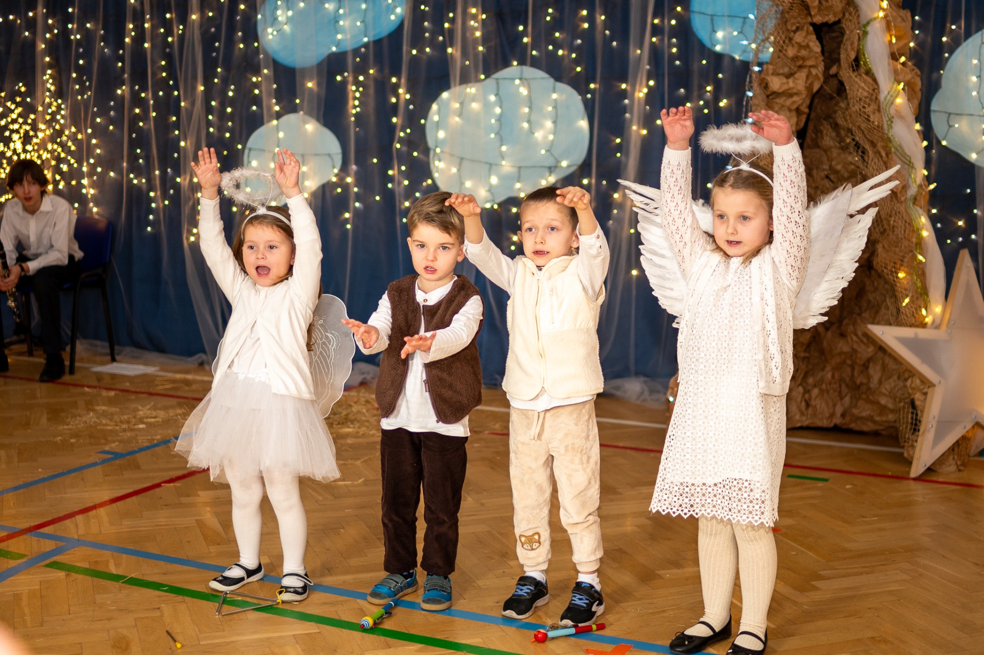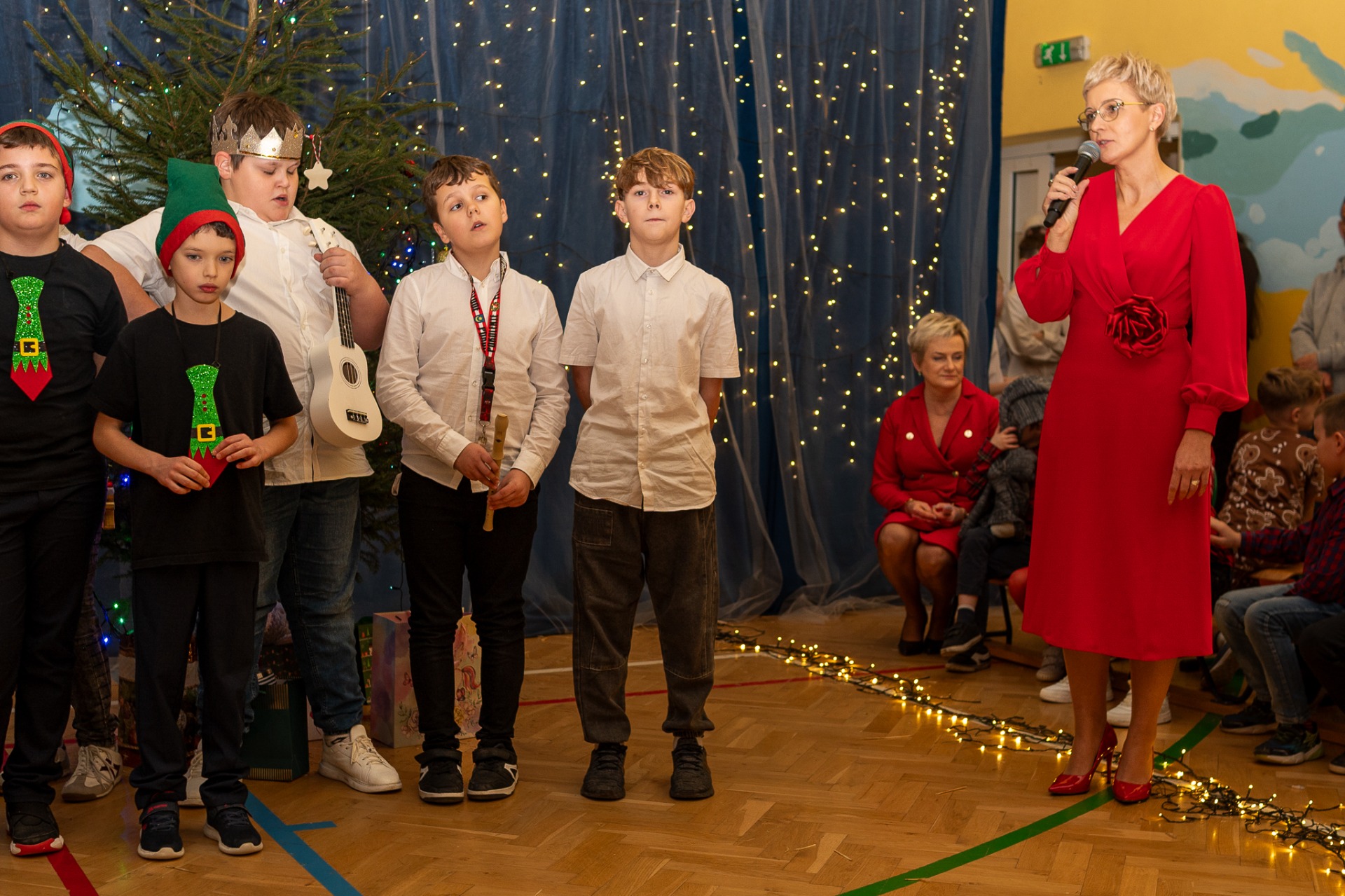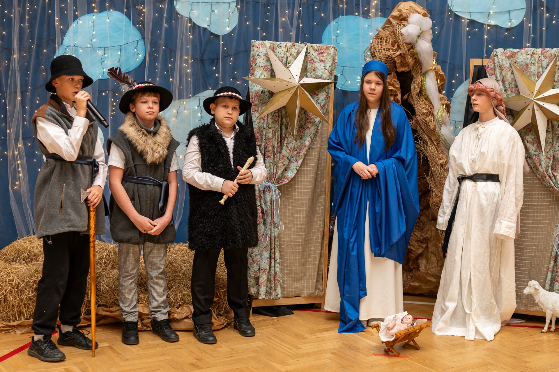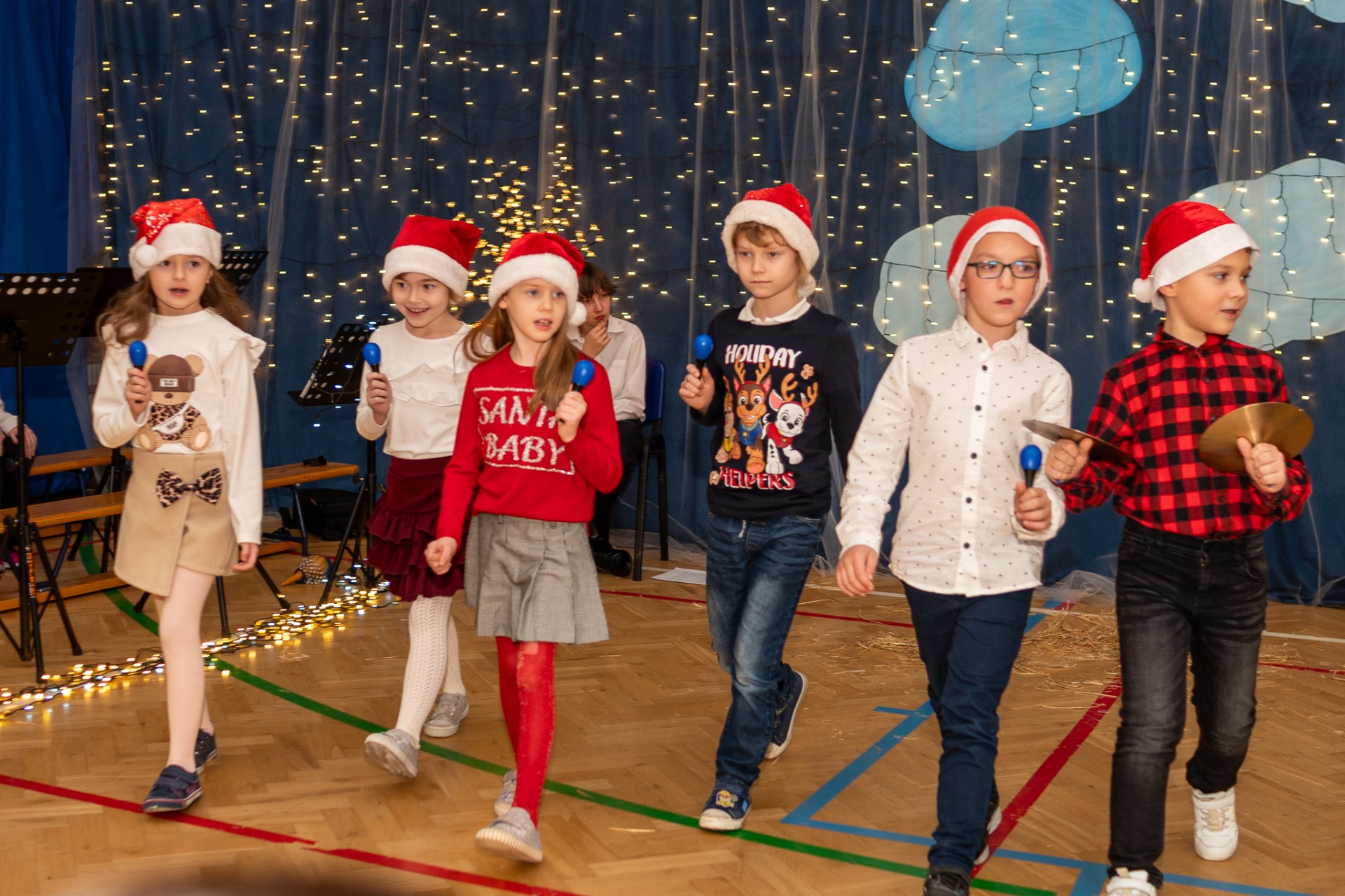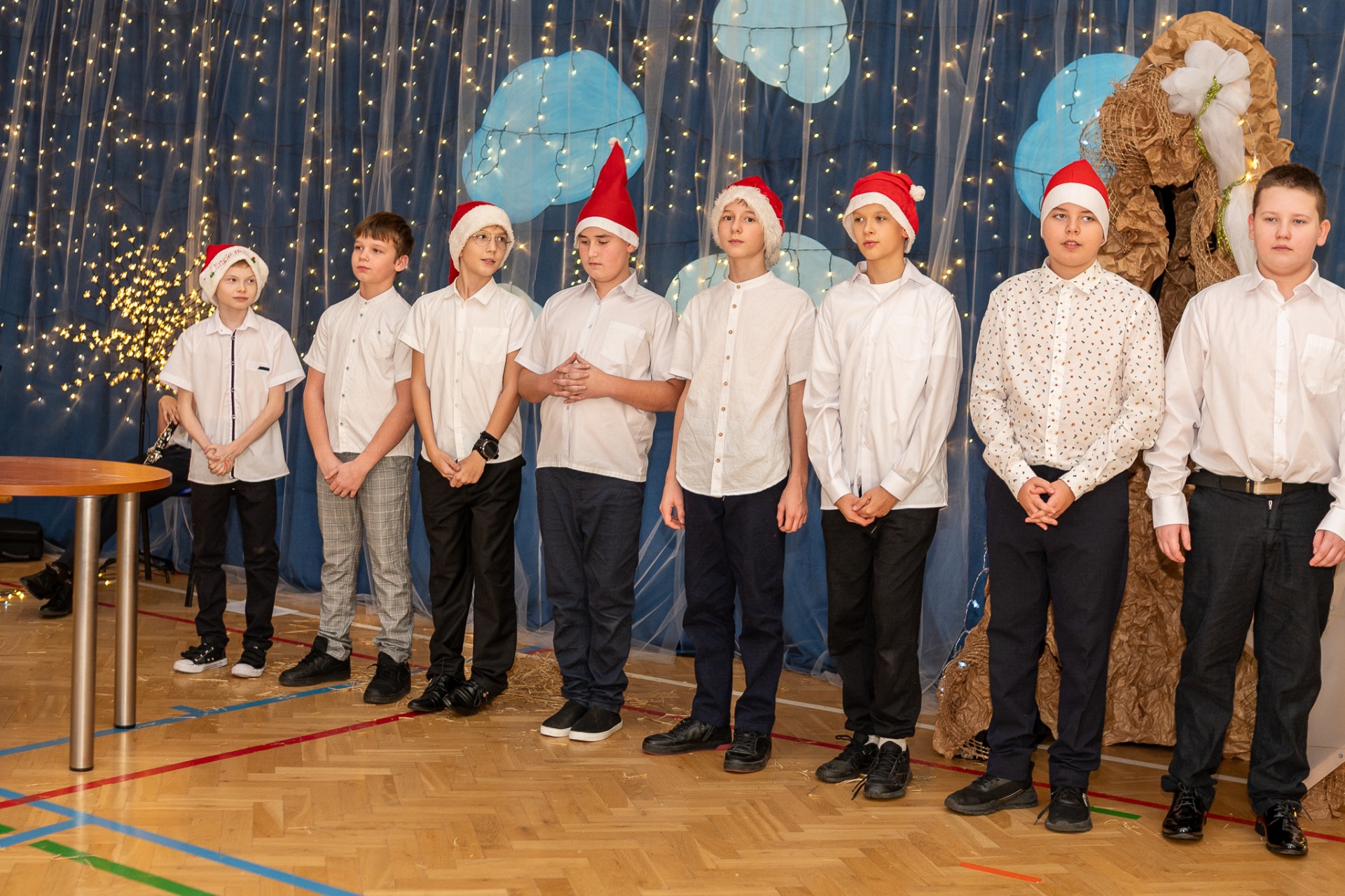 Centralnym punktem wieczoru były Jasełka, przygotowane przez szkolną grupę teatralną. Młodzi aktorzy zaprezentowali się z ogromnym zaangażowaniem, a ich występ został nagrodzony gromkimi brawami. Niezwykłe wrażenie zrobił również szkolny chór, który wspaniale wykonał nieznane wcześniej widowni pastorałki, wprowadzając wszystkich w nastrojowy, refleksyjny klimat. Podczas wieczoru każda klasa oraz przedszkolaki zaprezentowali przygotowaną kolędę lub pastorałkę. Różnorodność wykonań, dziecięca radość i szczerość występów sprawiły, że na widowni nie brakowało wzruszeń i uśmiechów. Ogromną atrakcją dla najmłodszych – i nie tylko – była wizyta prawdziwego św. Mikołaja. W specjalnie przygotowanym pokoju św. Mikołaja każdy mógł zrobić pamiątkowe zdjęcie: indywidualne, rodzinne lub z przyjaciółmi. Nie zabrakło także czegoś dla ciała – rodzice przygotowali pyszny, świąteczny poczęstunek, który dopełnił ten wyjątkowy wieczór i sprzyjał dalszym rozmowom oraz wspólnemu spędzaniu czasu.