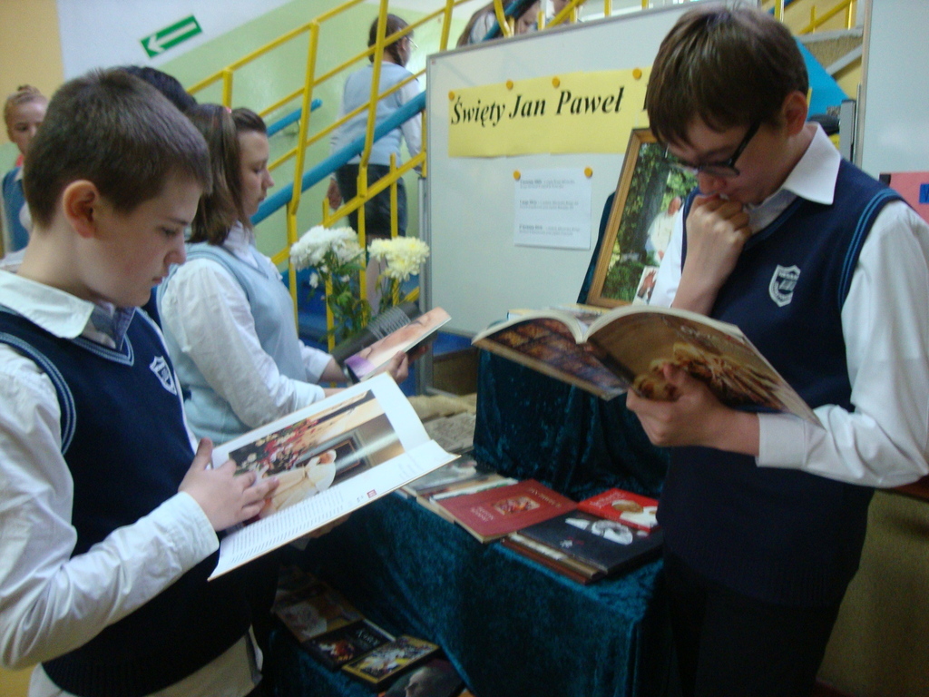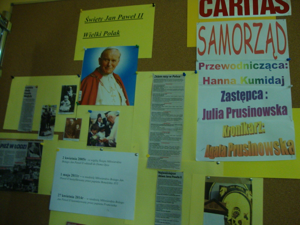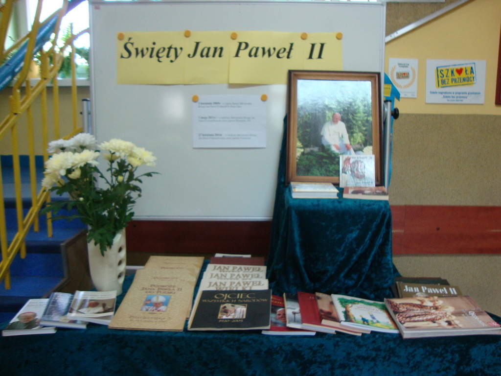 27 kwietnia cała Polska żyła uroczystością kanonizacji papieża Jana Pawła II. Dla rodaków tego wielkiego, ale niezwykle pokornego człowieka, to ogromny zaszczyt, że znalazł się w gronie świętych. Z tej okazji w szkole przygotowano wystawkę poświęconą Janowi Pawłowi II.